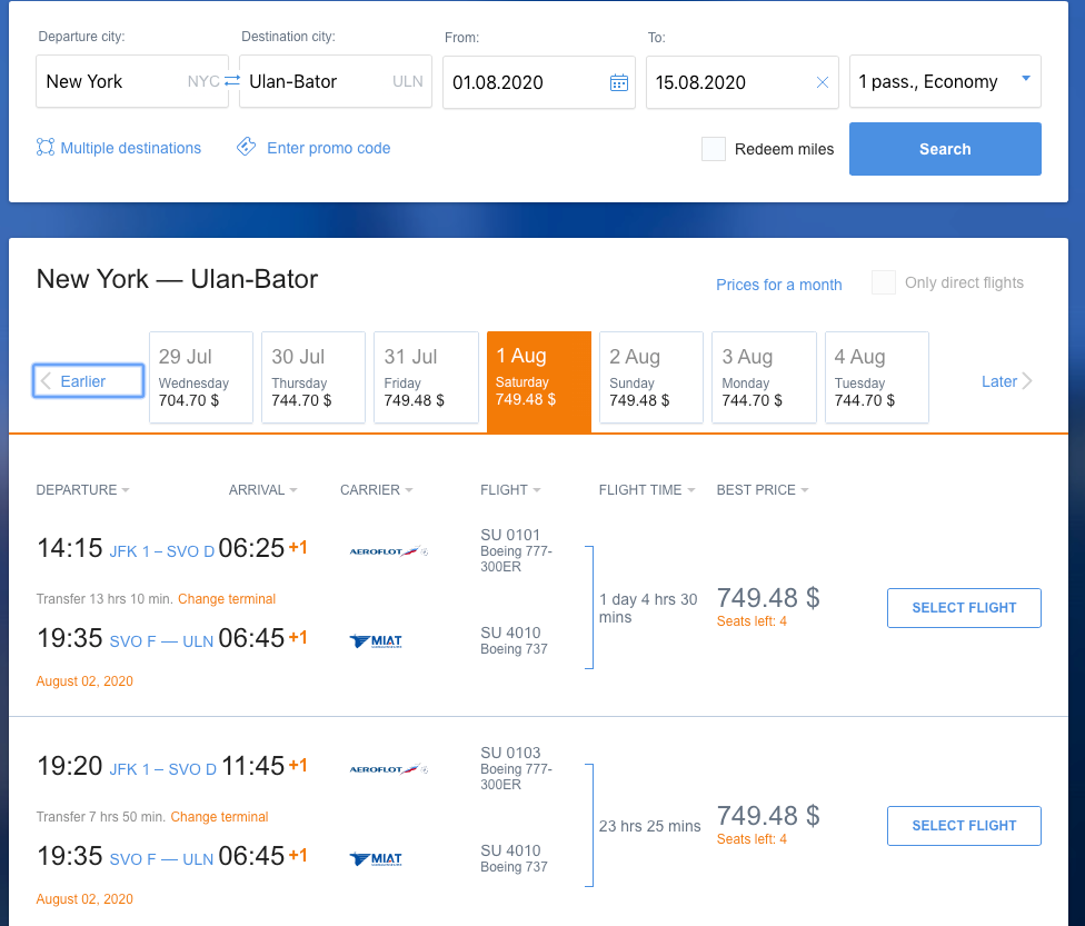 For a two-week trip from New York to ULN in August, the cheapest is currently Russian airline Aeroflot via Moscow, with a $750 round-trip airfare in economy or a very attractive $2,044 in business class. The latter is especially enticing for someone who, like me, is a Delta flyer. Aeroflot is a member of the SkyTeam alliance, meaning I would earn a ton of Delta elite-qualifying miles on those flights. I could not find those low Aeroflot airfares on Google Flights, but they were available on the airline's site. (If an eight-hour layover in Moscow seems daunting, keep in mind the Aeroflot lounges at Sheremetyevo airport are large and well-appointed, and accessible to Priority Pass cardholders.)