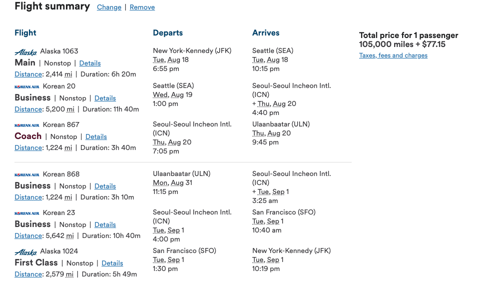 Using points and miles, you could go business class round-trip on Korean for 105,000 Alaska Airlines miles with two stops, via Seattle and Seoul. The routing is long and a bit inconvenient, with an overnight in Seoul, but the price isn't bad and Korean's biz class is certainly worth a splurge. At our valuations, 105,000 Alaska miles plus $77.15 in taxes and fees equates to $1,967.15 — a very good deal for a flat bed to Asia and back. Note that the domestic and intra-Asia legs on the outbound trip would be in coach.