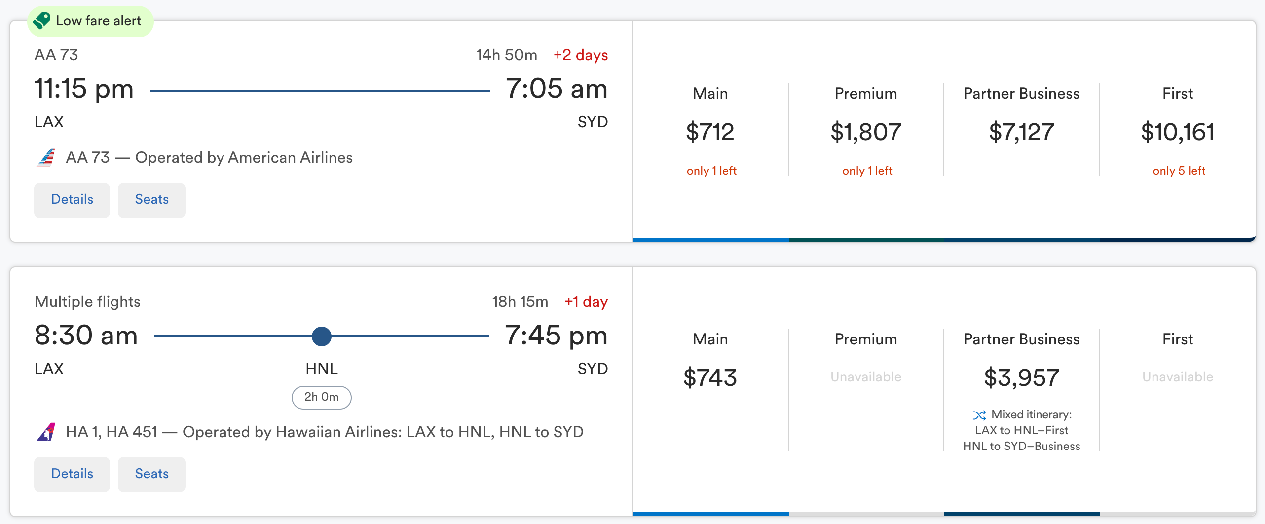 This limits your options, and you may miss out on savings if there are cheaper flights available on excluded partner airlines. For example, this Hawaiian Airlines flight from Los Angeles to Sydney would cost $743 in Main Cabin, but you could save money on the first leg of your round-trip journey by taking an ineligible flight operated by American Airlines for $712.