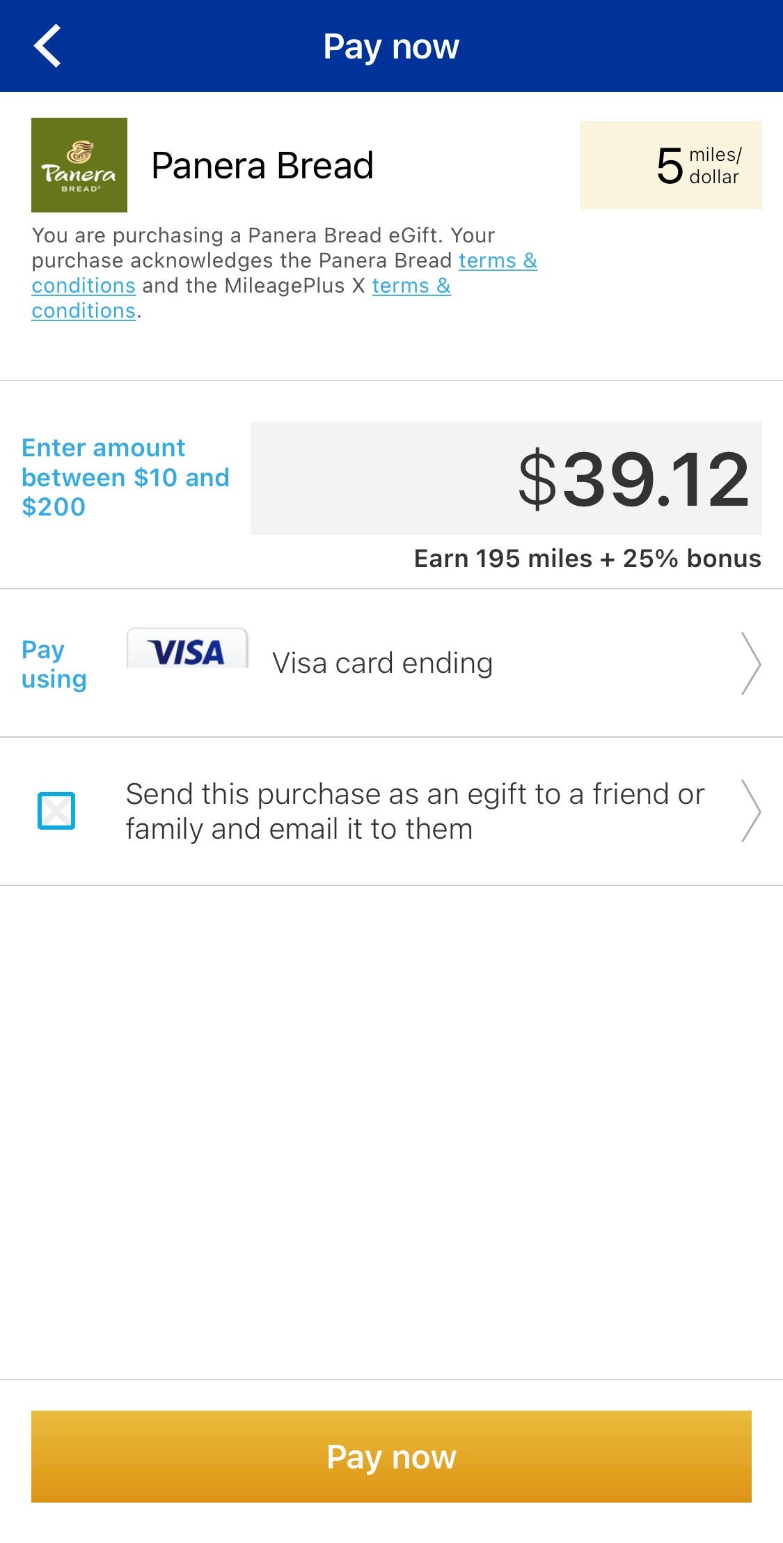 In this case, my family's order comes to $39.12. Next, I head to the MileagePlus X app before I pay for the order. I enter that amount as the total needed for this Panera order.