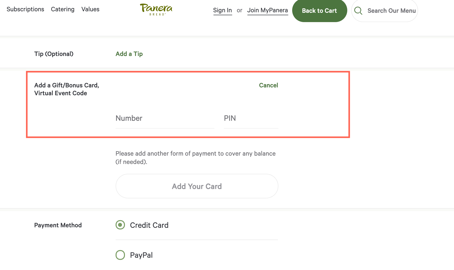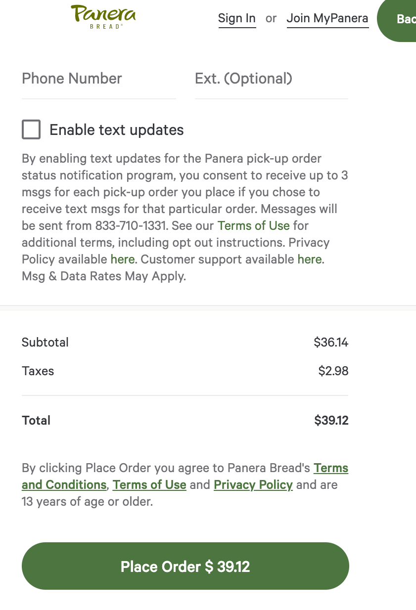 First, I head to Panera's website and select my pick-two salad-sandwich combo as usual. When I'm on the check-out screen I can see exactly what the order will cost.