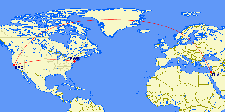 Me? I flew from Tel Aviv (TLV) to New York (EWR) via San Francisco (SFO).