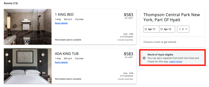 When you click an individual hotel to select your room, you'll see another banner on the right indicating that you can earn rewards from both the hotel and Chase.