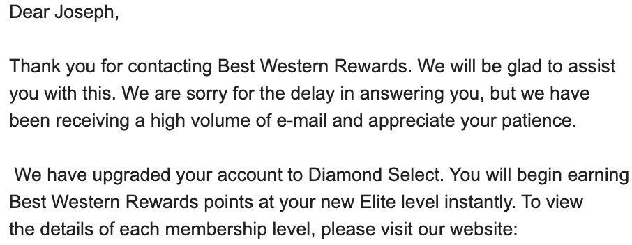 I booked a hotel in Oregon for later this year. I then realized the hotel brand is under the Best Western umbrella. I immediately sent a message to Best Western letting them know I have Marriott Titanium status, and I was hoping for a status match. Within hours they emailed me back confirming I was a recipient of their highest elite status, which normally requires 50 nights or 40 stays at Best Western property per year to achieve.