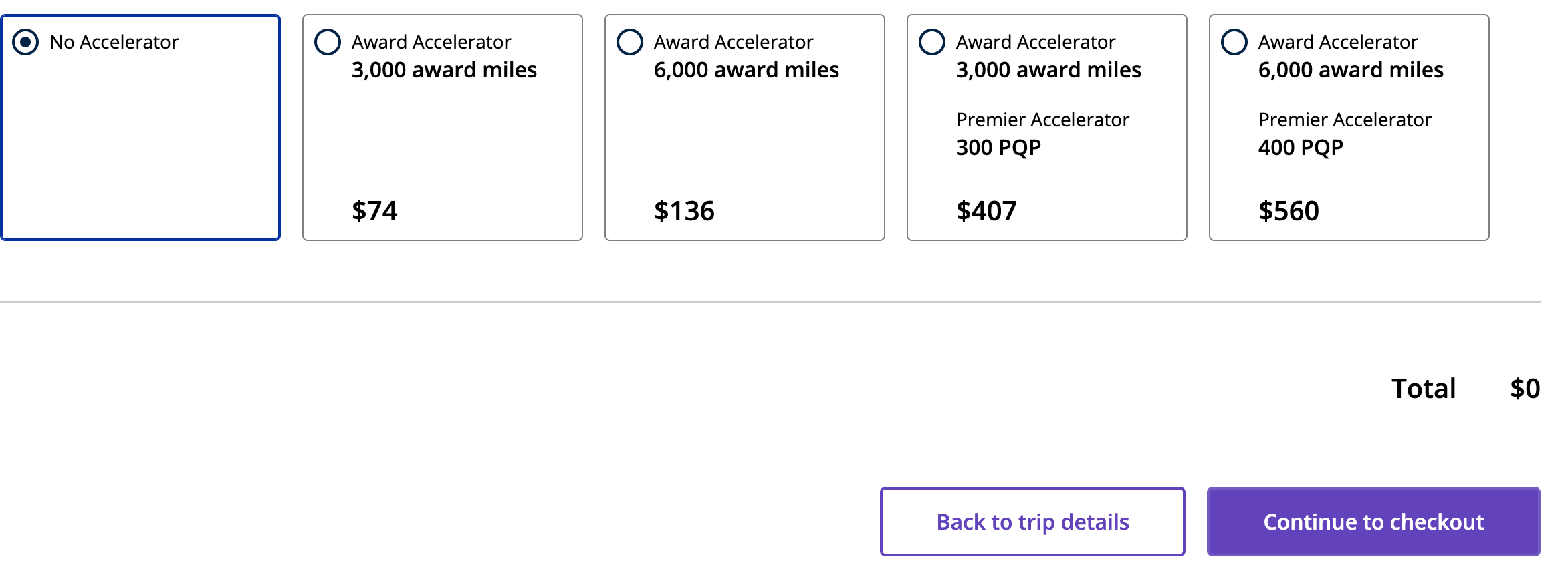 If you have future trips planned on United this year, log into your account and find your reservations. You might see an "Award Accelerator" option listed when you are looking at your trip details. You may also see this option pop up as you check in for United flights. While most of the Award Accelerator options are simply redeemable United miles you are purchasing at a fixed cost, some of the pricier packages include PQPs.