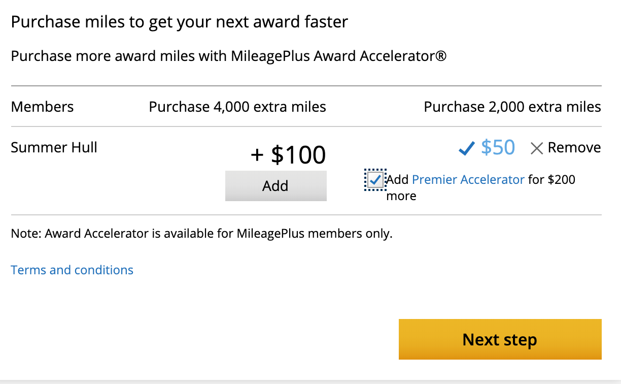 If you see that prompt and click, you'll the have the opportunity to buy additional miles in predetermined increments. Usually, the lowest package offered is 4,000 or 5,000 miles, but I needed fewer than 2,000. (Make sure you click "add Premier Accelerator" as shown below if you want the miles to count for elite status purposes.)