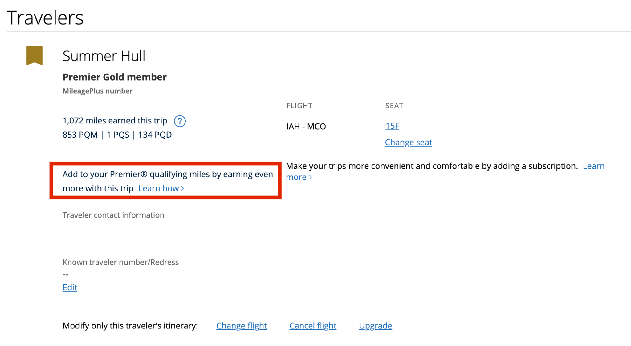 To find opportunities to purchase elite qualifying miles online, you can look at your existing flight reservations in your United.com account. You may see an option to add Premier qualifying miles to the trip, as I highlighted in red below.