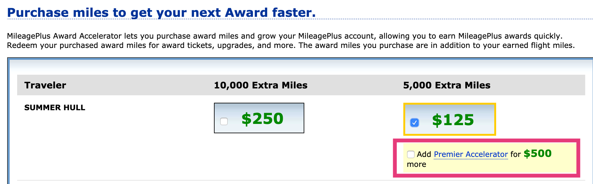 The price per mile can vary, but my all-in offers that included Premier Accelerator were consistently priced at 12.5 cents per mile. If I bought a few thousand more miles than I needed, it would have cost hundreds of dollars extra. That's a waste, as United miles are only worth 1.3 cents each according to TPG's most recent valuations, so this is only truly something you do to close the elite status gap.