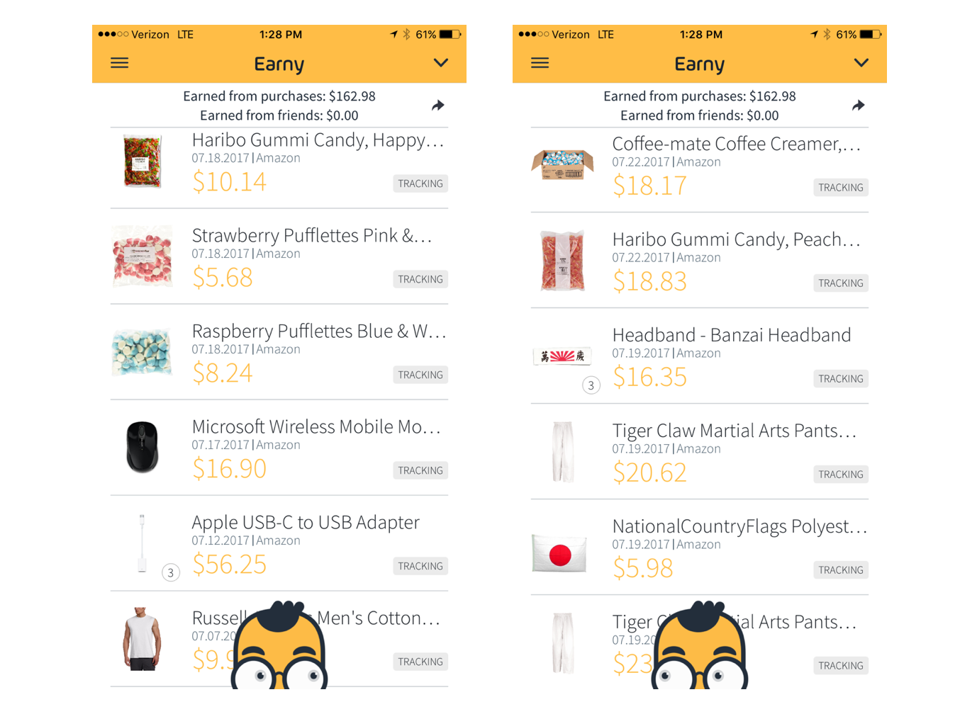 The app itself is easy to use: Once an account is created, Earny starts tracking all any purchases you make with its included retailers. In the example below, Earny is tracking purchases made via Amazon over the course of a few days. These purchases will appear in the "Tracking" option at the top of the screen.