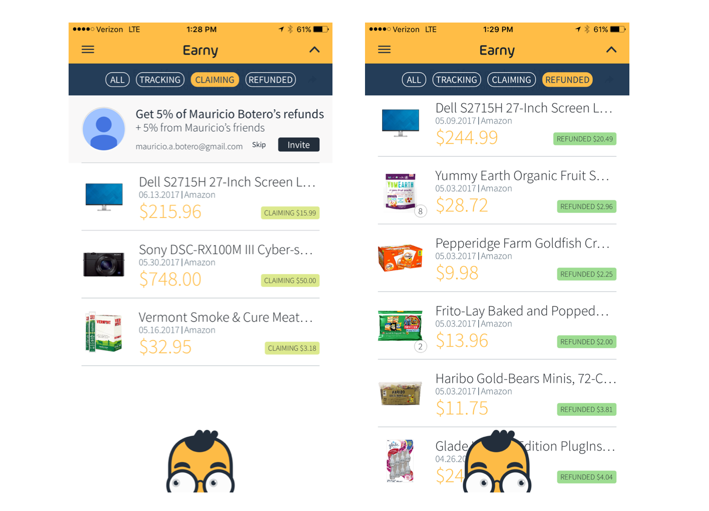 When you sign up for an Earny account, you'll link your email account along with your credit card. Once you have an account, Earny monitors your purchases via e-receipts in your inbox and checks back on those items to see if there is a price drop. Earny, a yellow figure whose eyes follow your movements in the app, automatically tracks every purchase you make at any of its partnered retailers.