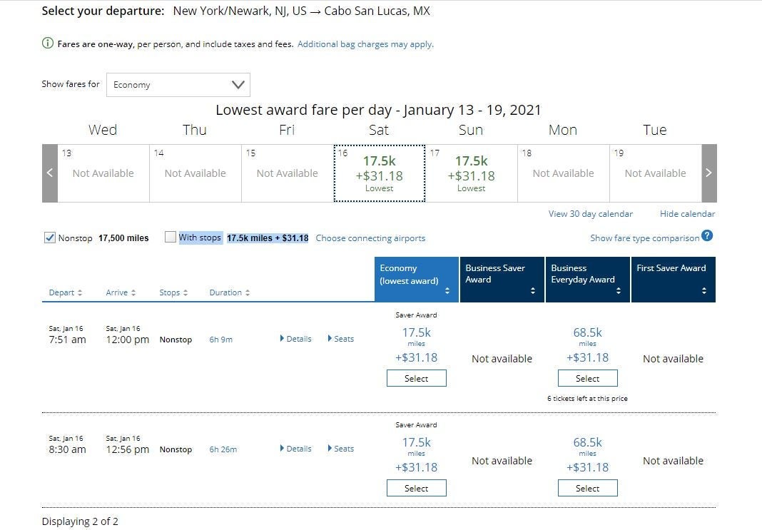 For United frequent flyers, United's website showed one-way award tickets from 17,500 miles in economy or 68,500 miles in business for mid-January.