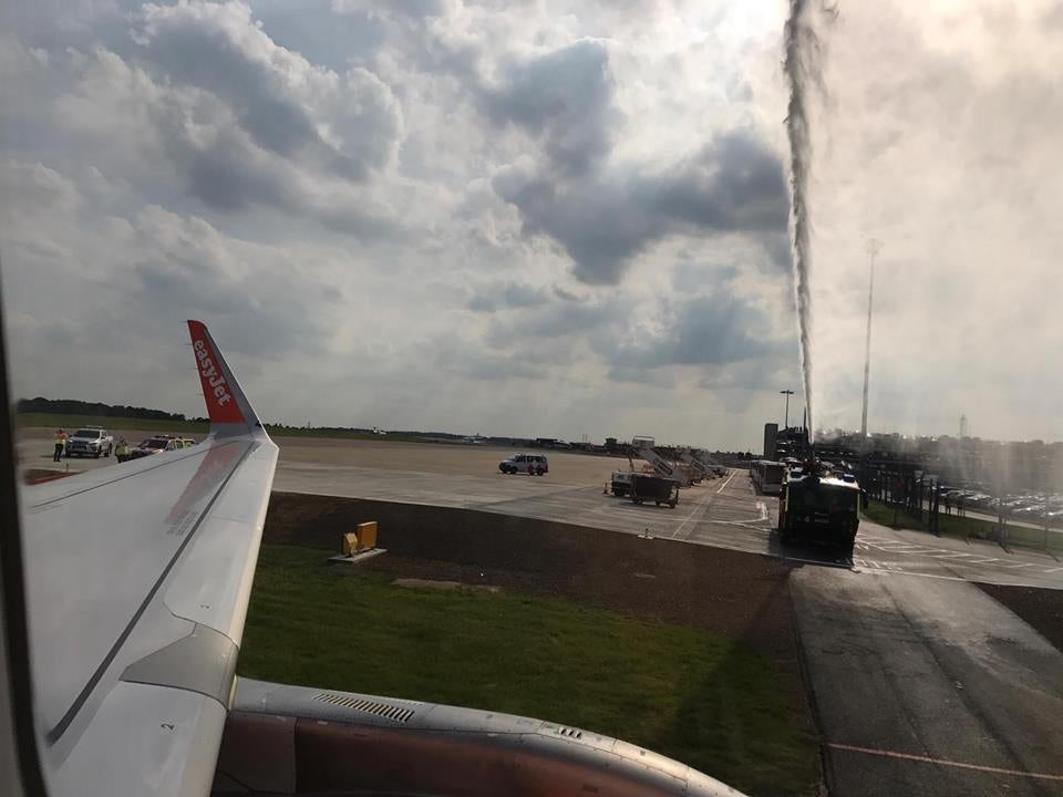 On arrival, the plane was greeted by a traditional water cannon salute.