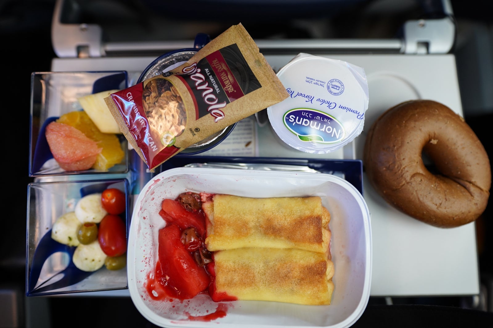 With an hour and 40 minutes left in the flight, we were served a complimentary breakfast fit for an Israeli king: two blintzes with fruit compote with a side of mozzarella and tomatoes, fresh fruit, a bagel with cream cheese and yogurt and granola and a very strong coffee. (I could have used this generosity on the wine pour the night before.)
