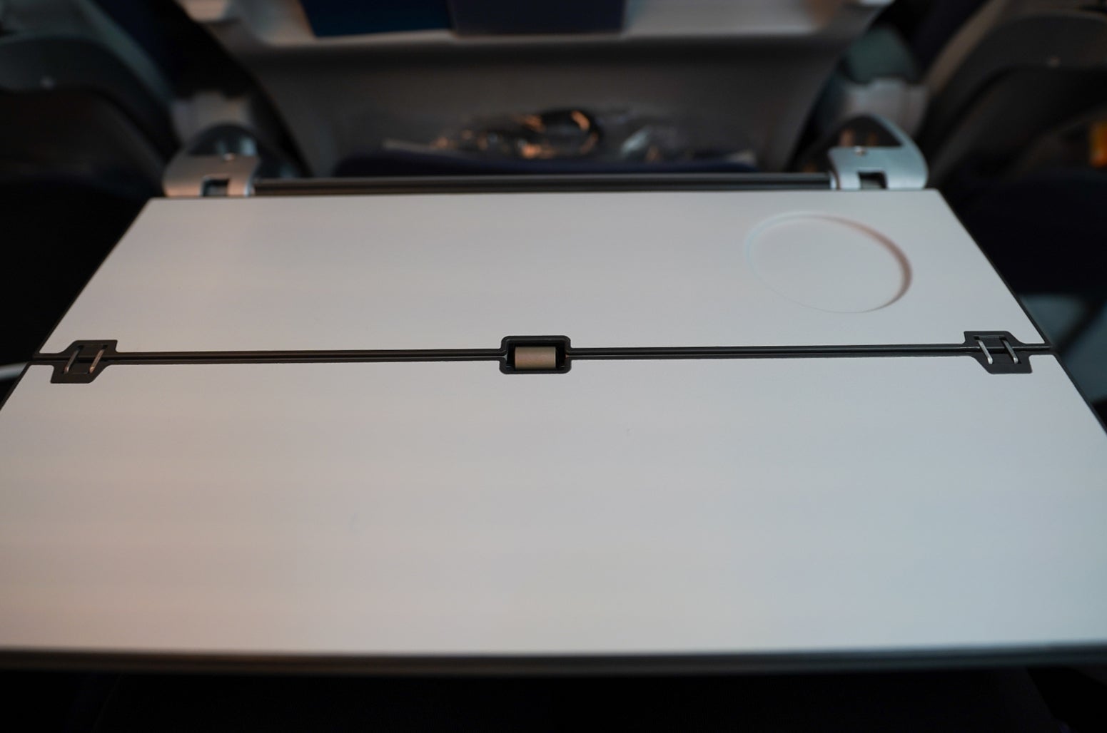 My 15-inch laptop didn't quite fit on the tray table with the screen up and the person in front of me reclined.