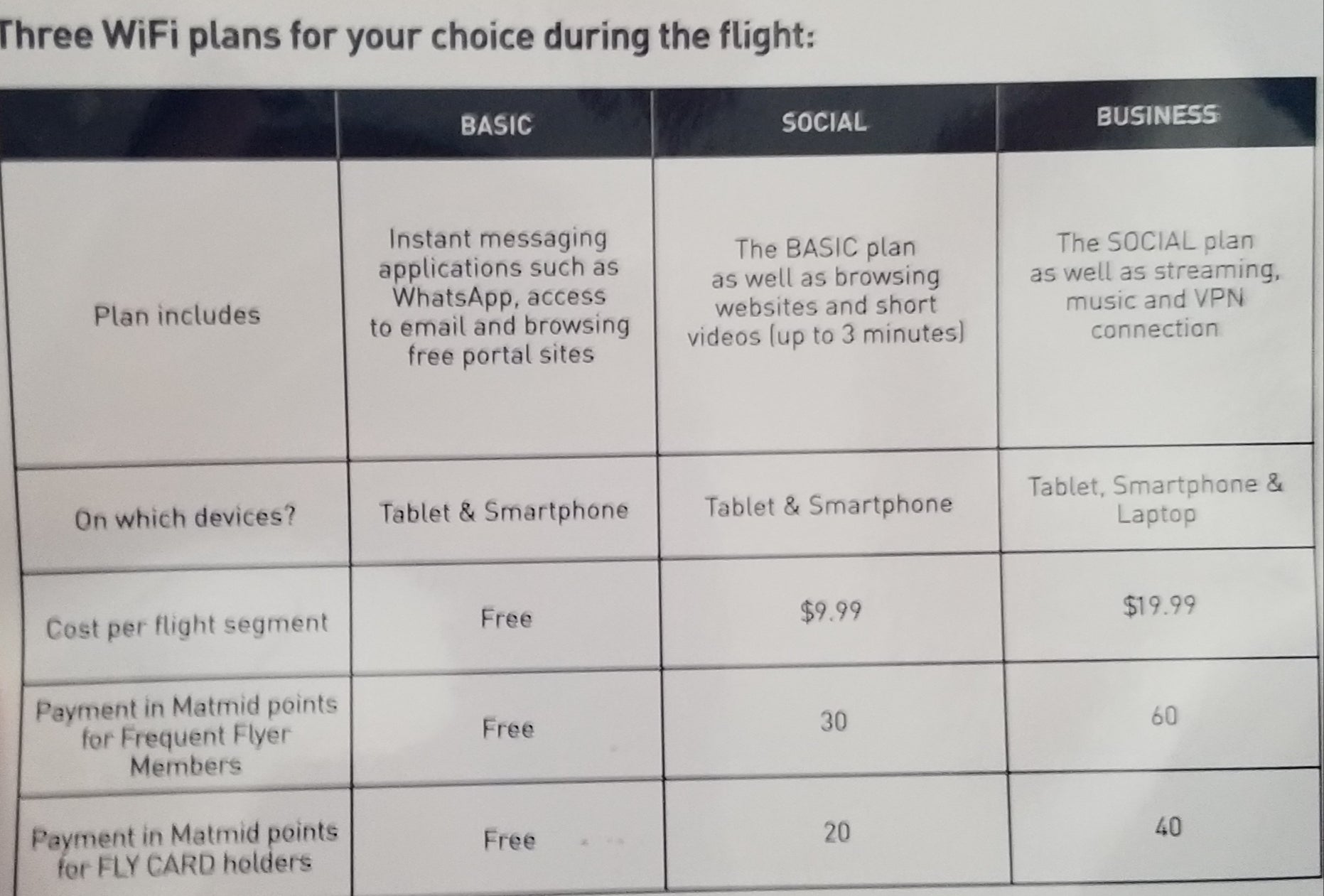 A mobile device plan with web browsing and short video streaming is available for $10 on the Tel Aviv-Paris route, while unrestricted laptop usage will run you $20 on the same route. Pricing details have not yet been released for the airline's flights to the US.