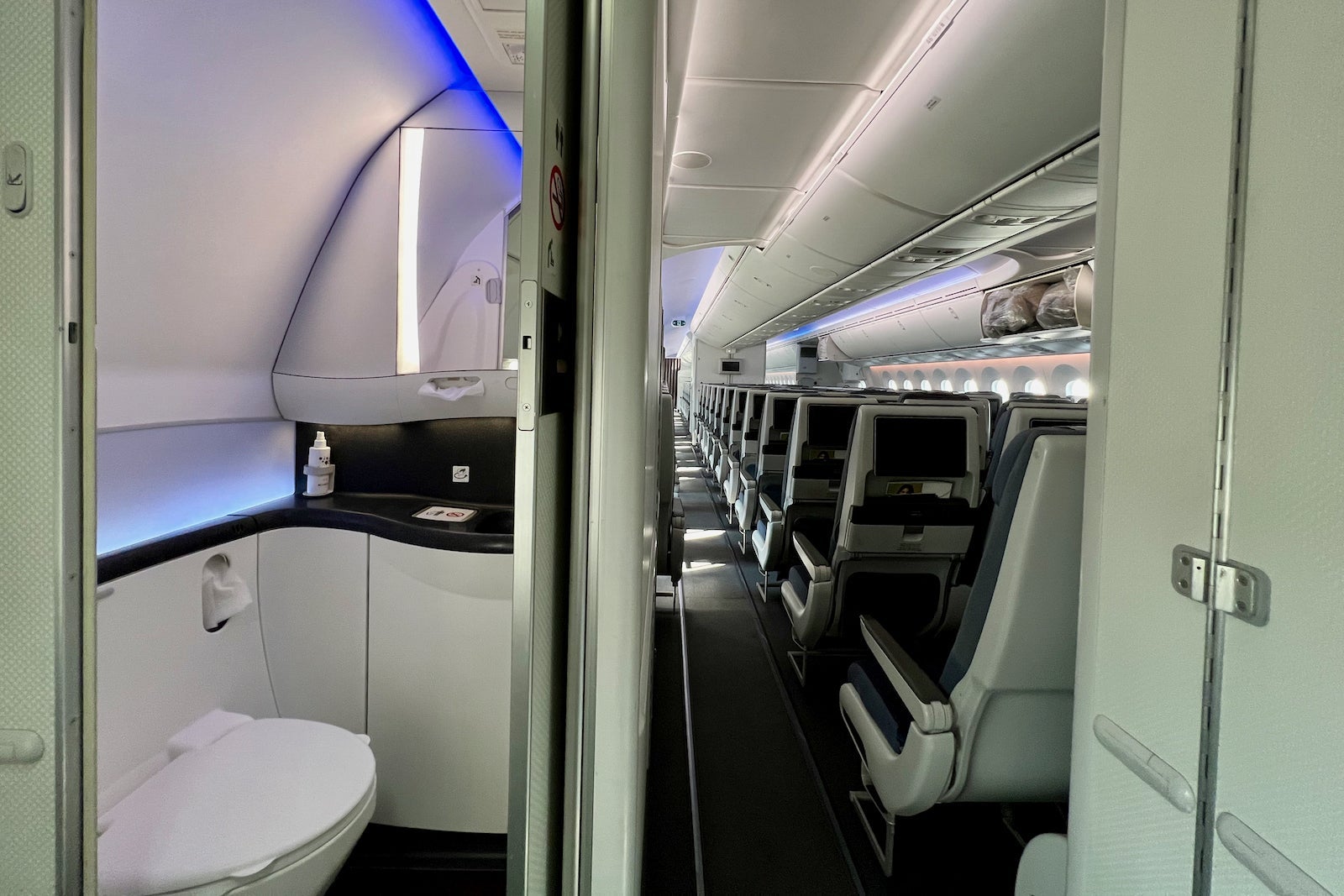 There are four lavatories in coach, two located in between the coach cabins, along with two at the rear of the aircraft. Each is equipped with a touchless sink and flushing mechanism.