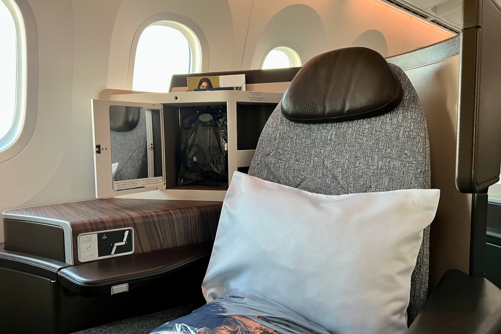 Interestingly, the window seats in Row 1 offer a bassinet area for those traveling with infants. If there aren't any children in biz, the bassinet area can be used as an additional storage compartment, making these two seats my second-best choice for those traveling solo.