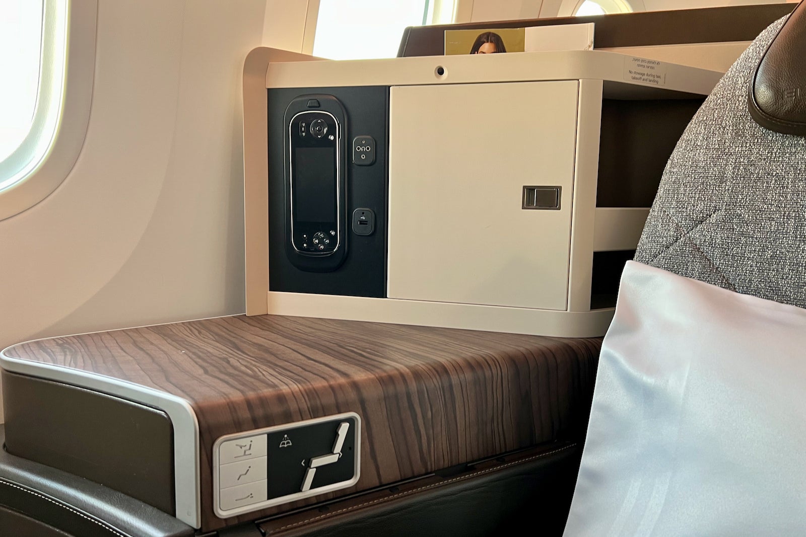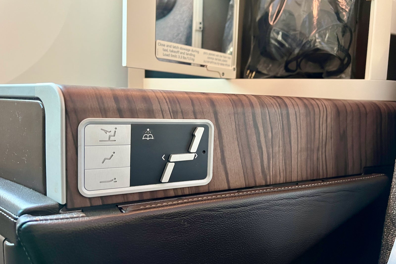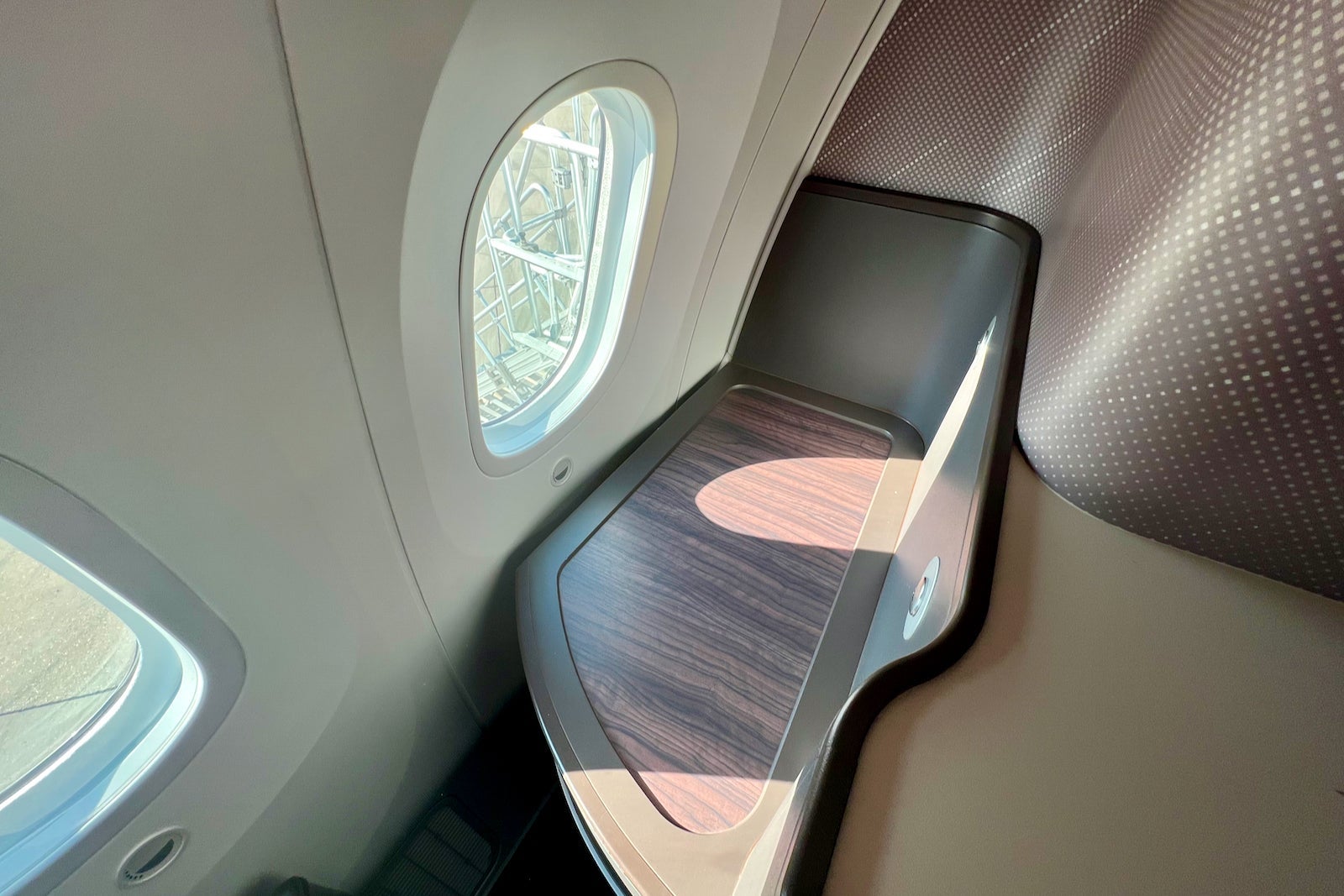 There's a small, enclosed storage closet at each seat, which is the perfect place to keep your wallet and other loose items during flight. Plus, the faux-wood side table is large enough to hold a laptop or iPad during the flight.