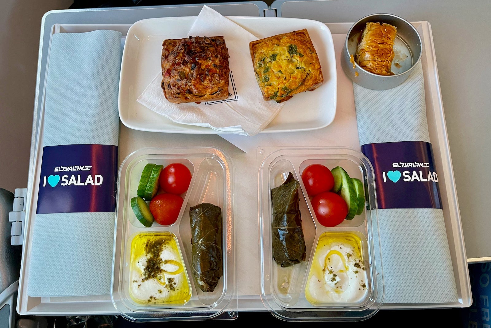 Many were enjoying the Arabic-themed breakfast as we soared high above Saudi Arabia. In addition to a cheese or mushroom quiche, the economy offering included stuffed grape leaves, served alongside a dollop of labneh and crudité, with a single piece of moist baklava for dessert.