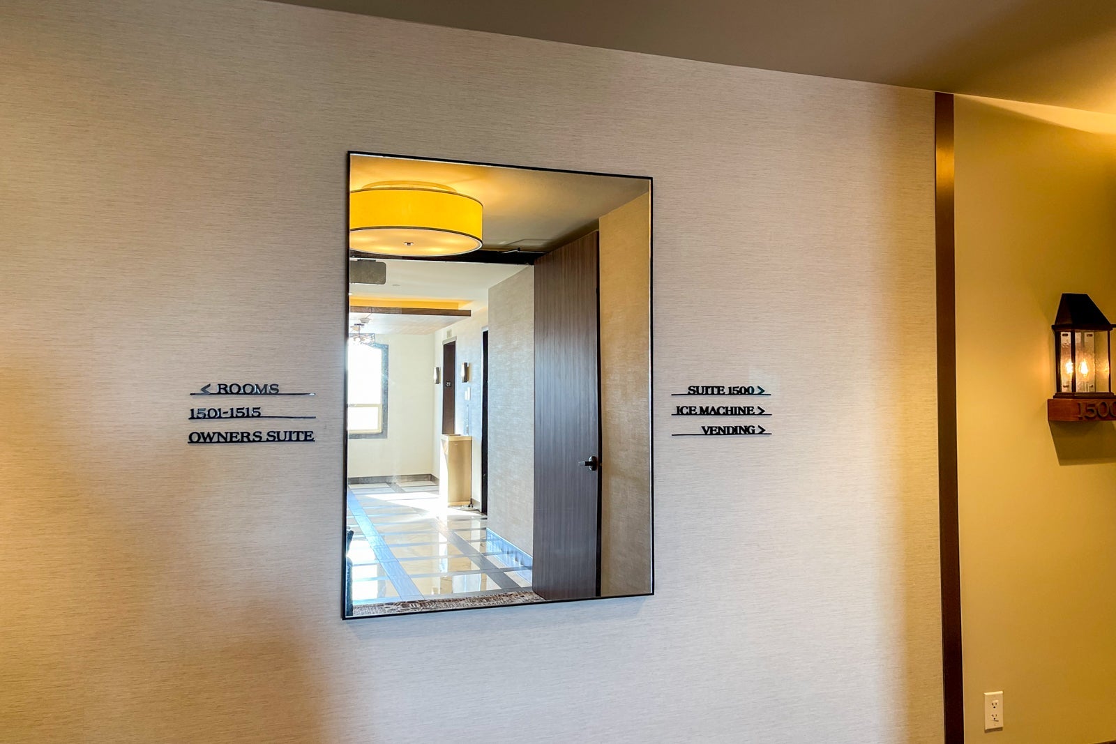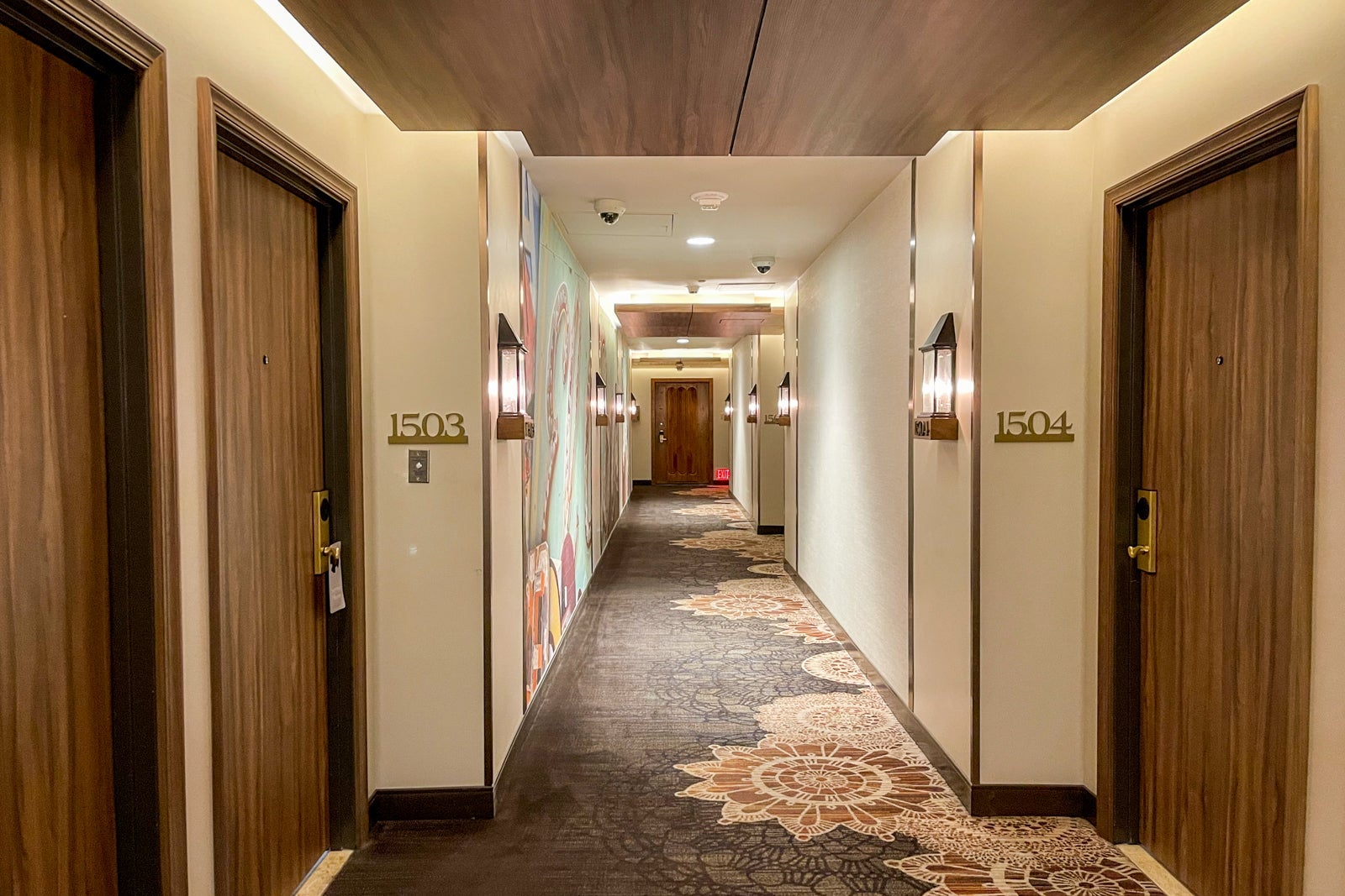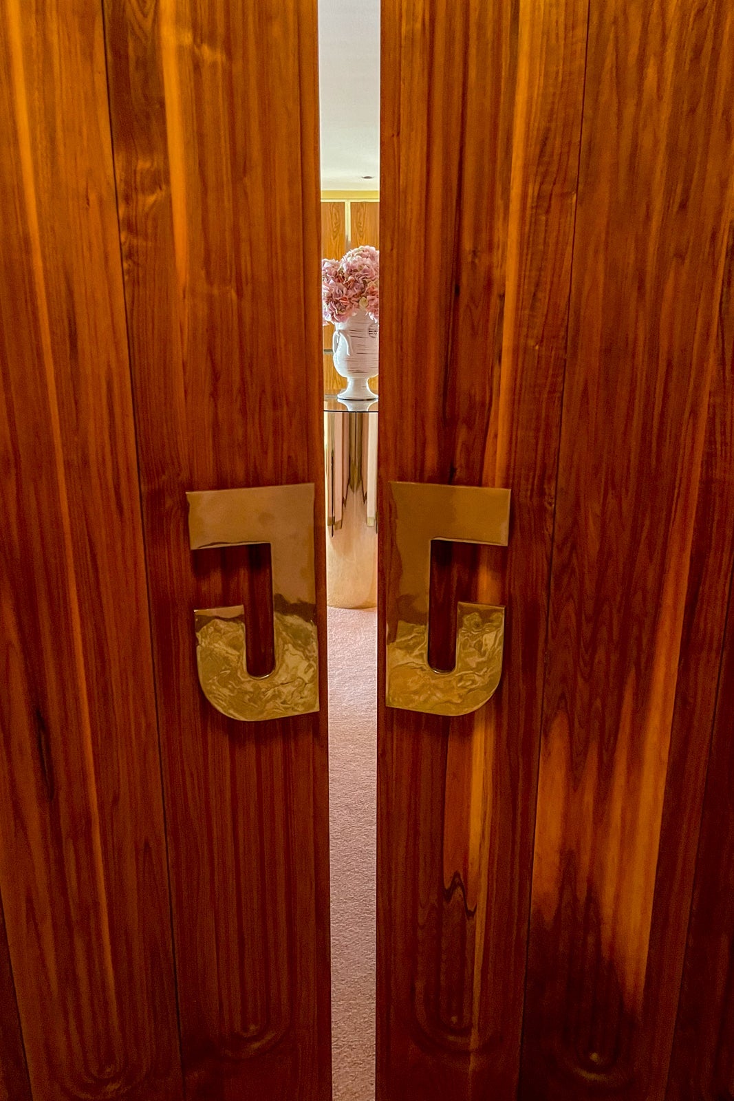Once inside, you are immediately greeted with the letters "J" and "G" on the handles leading into the suite's living and dining room area.