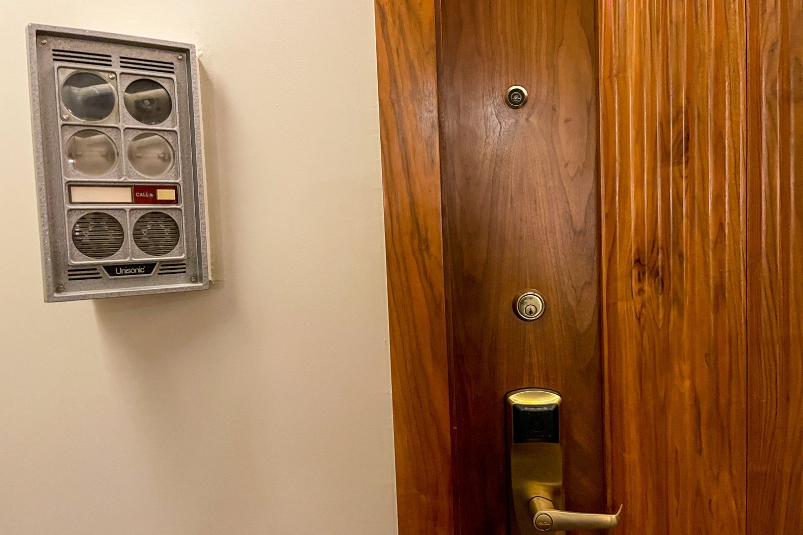 When you get to the door, the first thing you'll notice is a call box to the left.