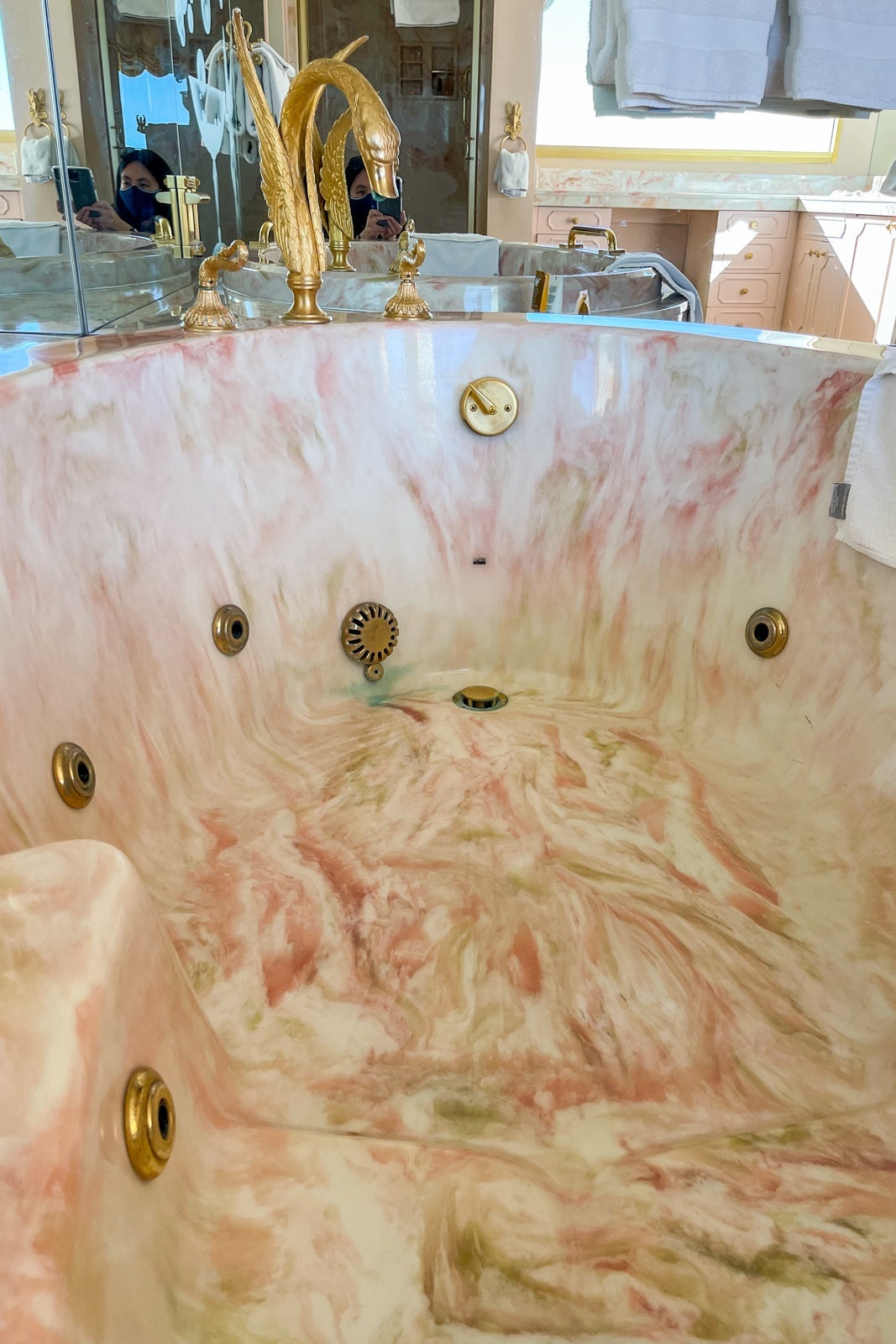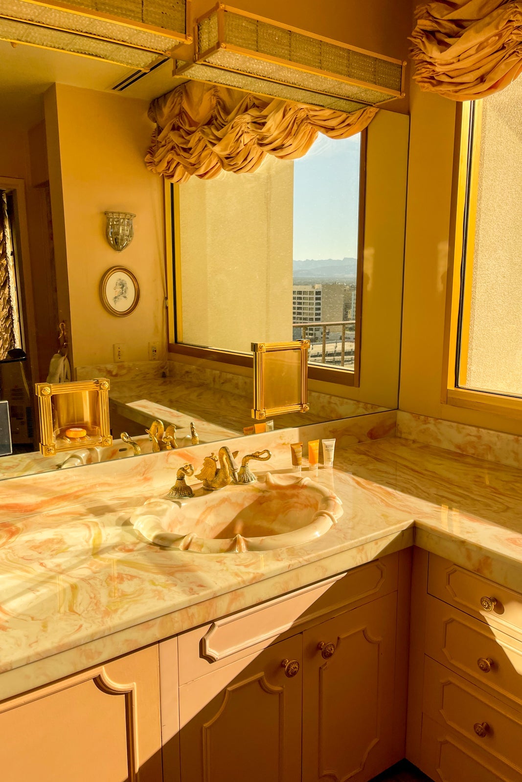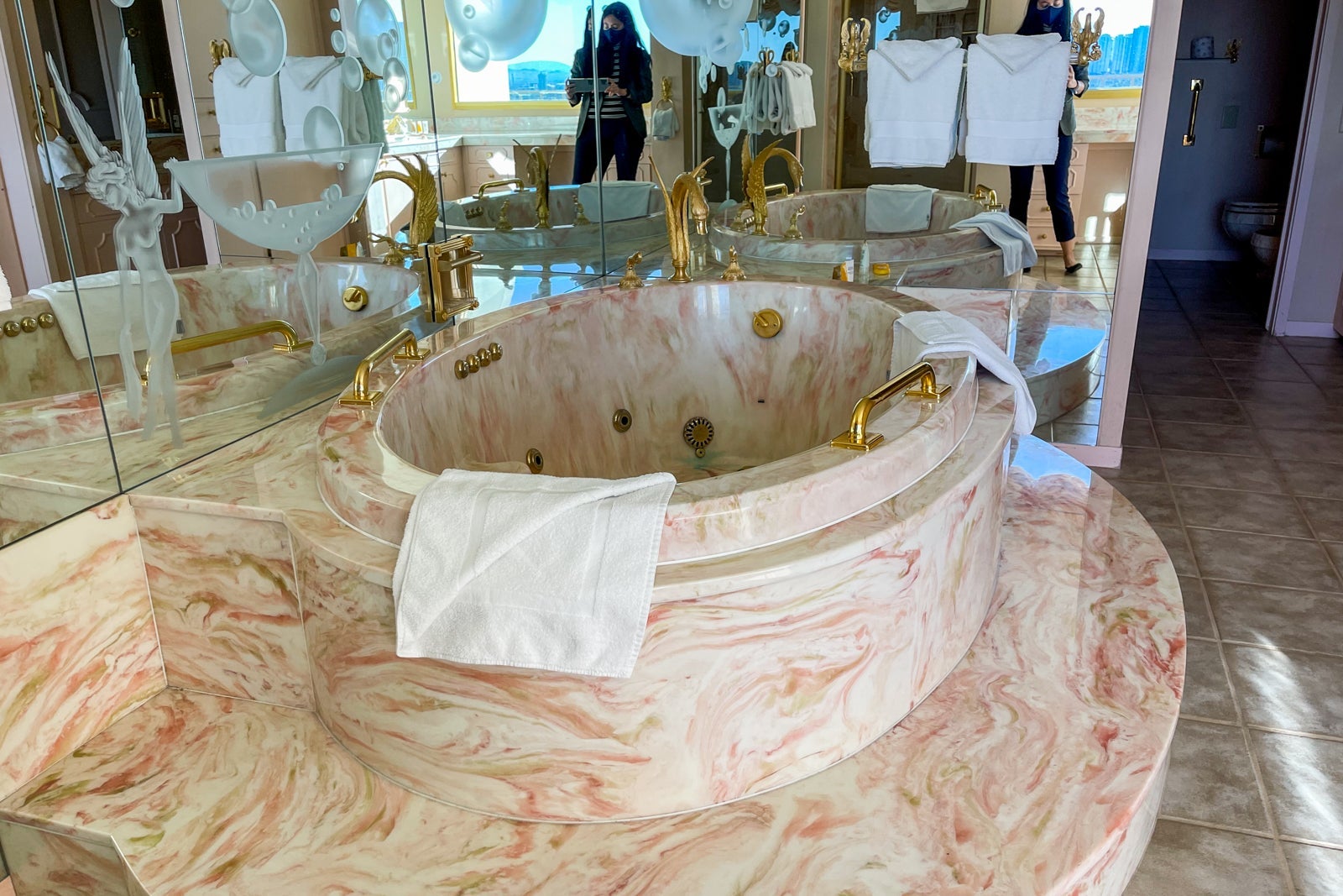It has stunning views of the Las Vegas skyline and mirrors everywhere. There's clearly no detail that was overlooked – including the golden swan faucets in the marble bathtub.