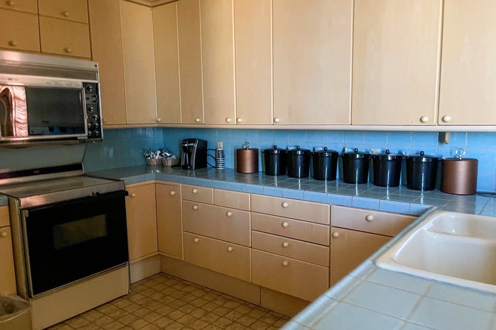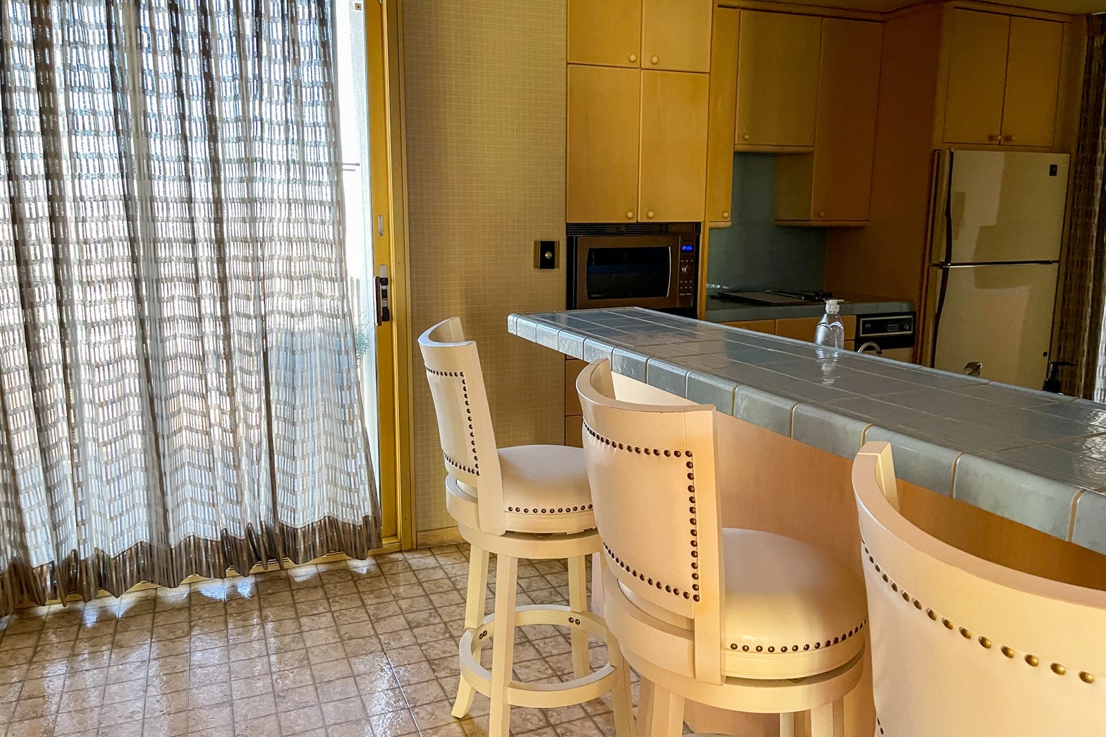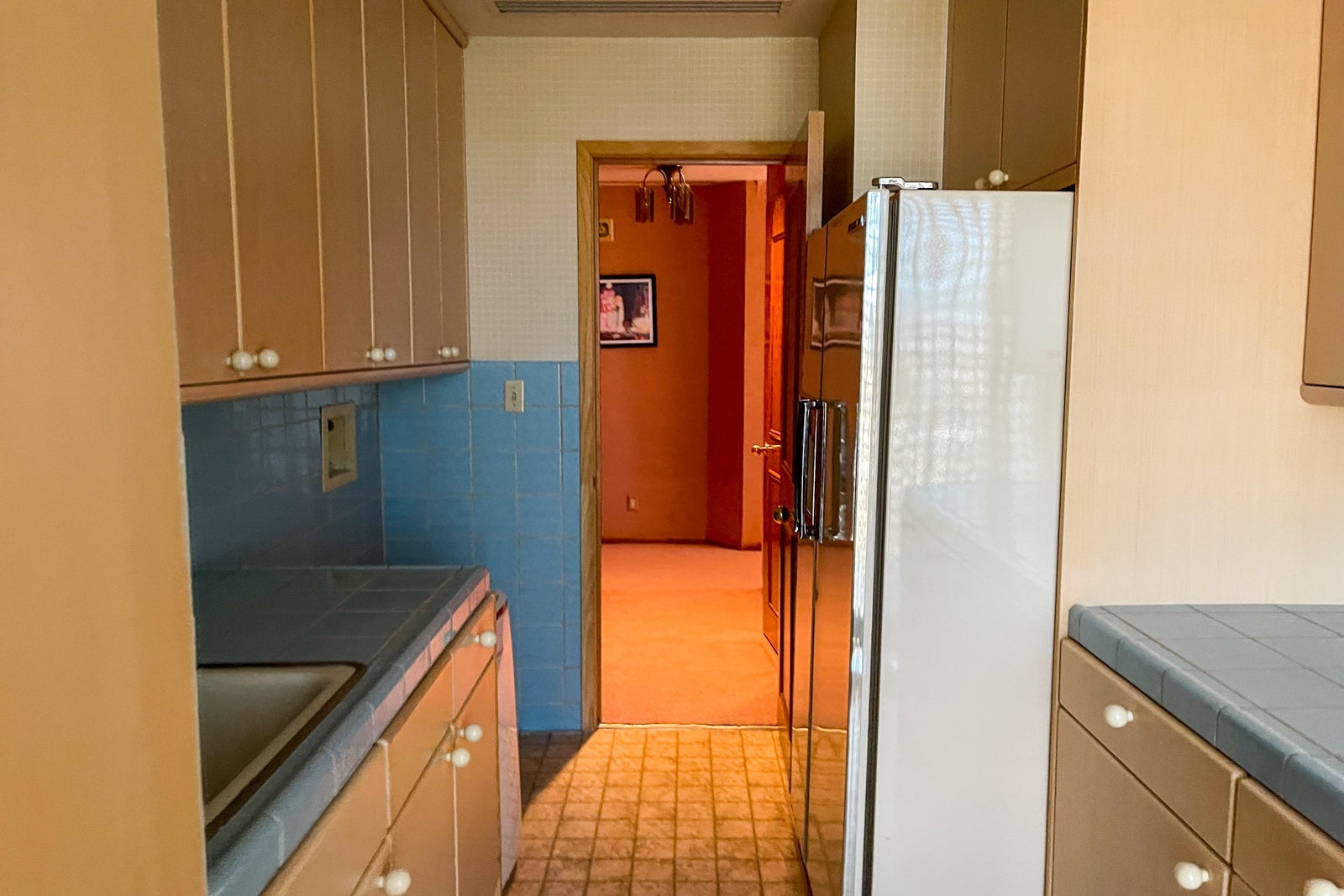 In the kitchen, most of the working appliances are from the 1980s, including the refrigerator and oven.