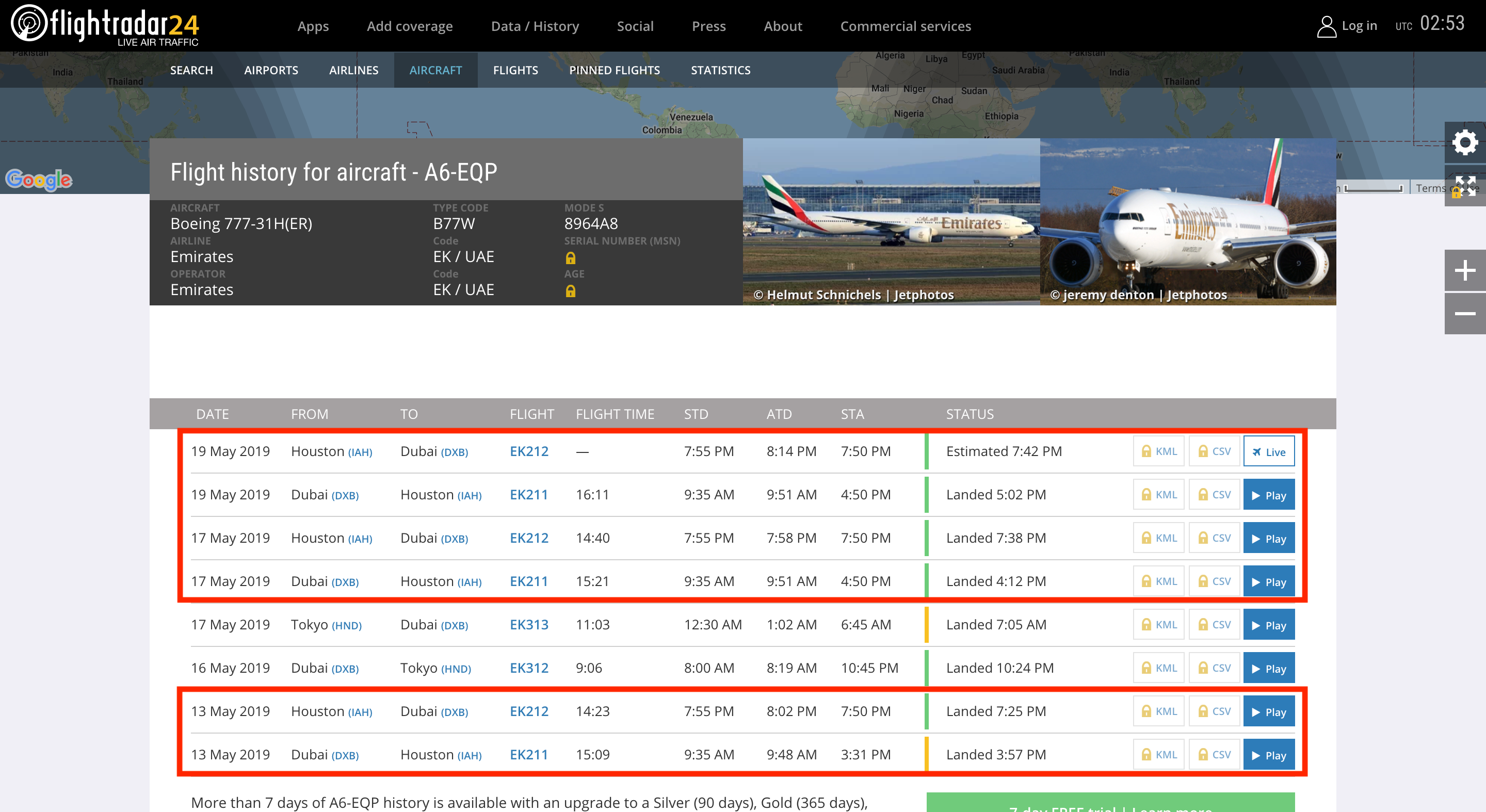 - Houston (IAH) to Dubai (DXB) EK 212: 5/21 (A380 service resumes from 5/22 onward)