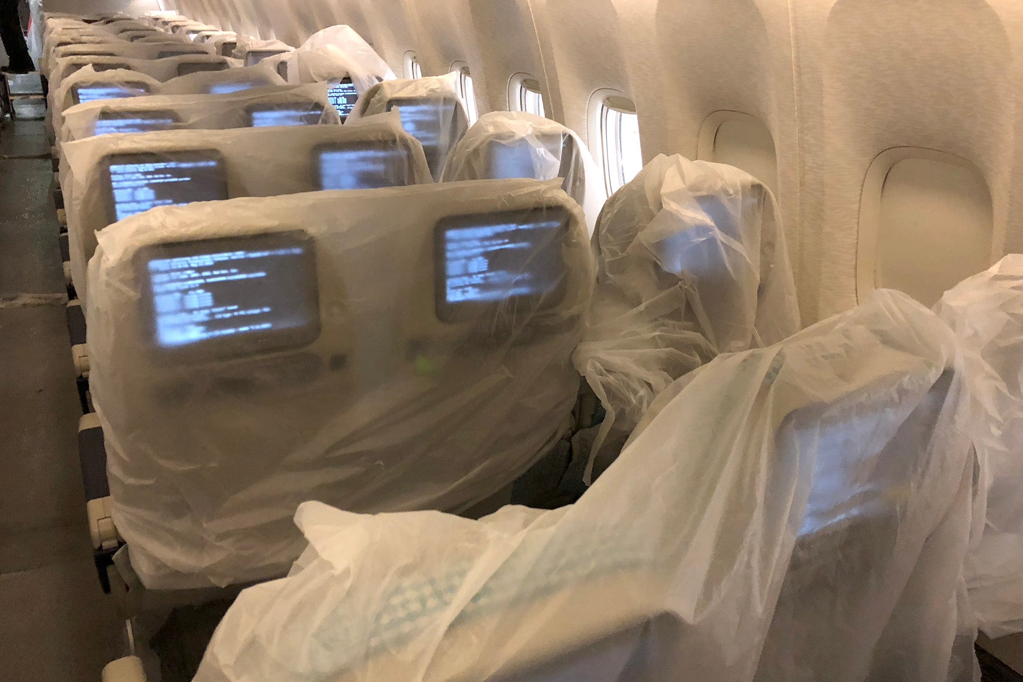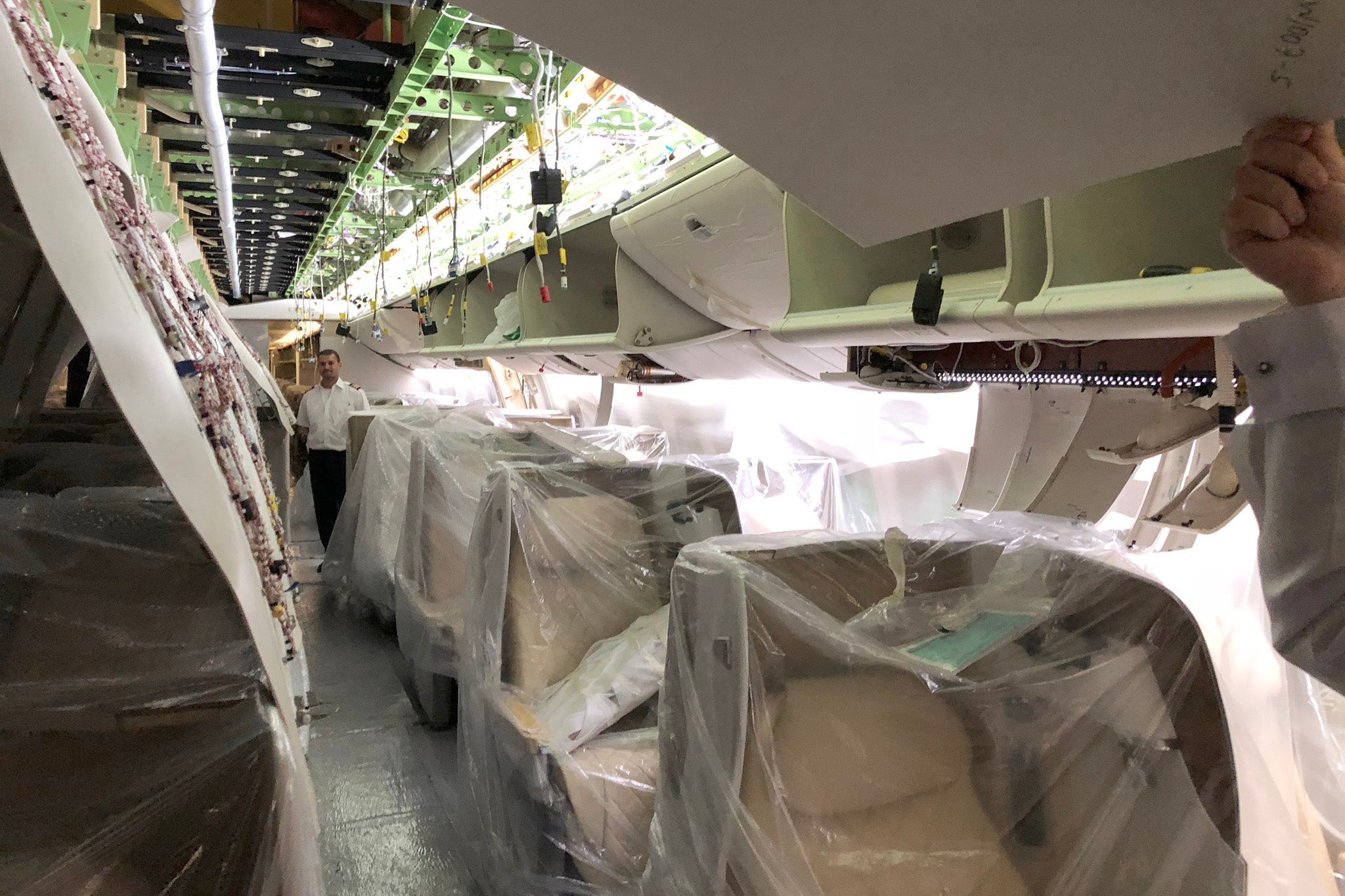 All 266 seats were yanked out, and then the real work began, with technicians working to upgrade electrical systems and wiring, update the galleys and lavatories and even raise the ceiling height in the business-class cabin by eliminating the center bins.