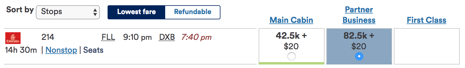 Business class will run you 82,500 miles in each direction — not a bad deal when you consider the high nonstop paid fares, at least in the business cabin.