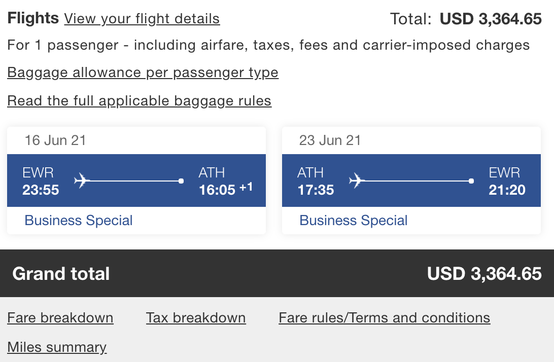 Of course, a consideration is that a premium cabin ticket can easily cost thousands of dollars. However, a $499 discount can still be a substantial savings. For instance, on a random date this summer, a round-trip, business-class ticket between Newark (EWR) and Athens (ATH) prices out at $3,365. With the card's $499 discount per ticket, that's nearly 15% off, for a total of $2,866 per passenger.