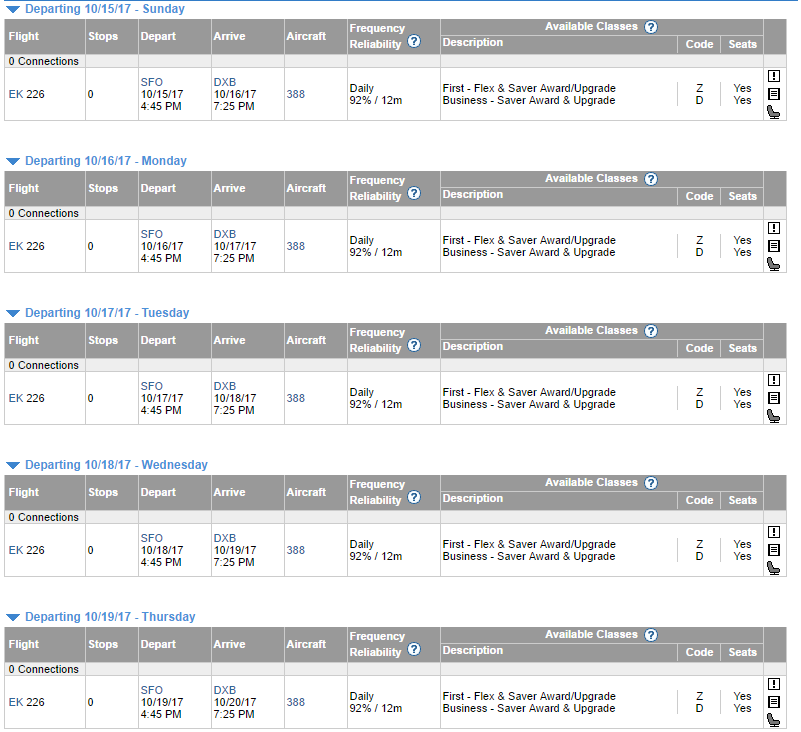 Or, you've got over five months to book on the SFO-DXB route. While the summer has tight award availability, there are plenty of dates in October with awards in both first and business: