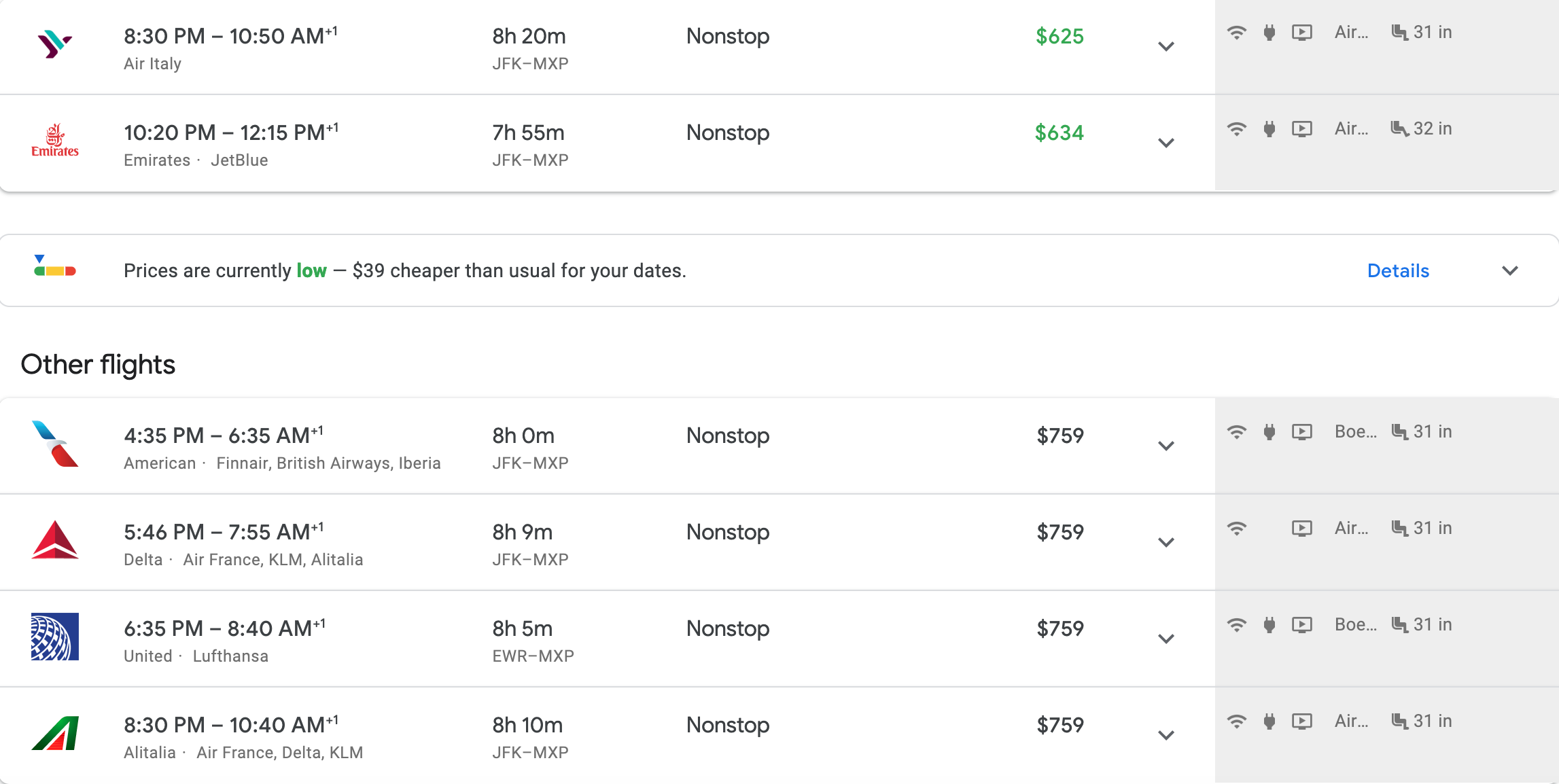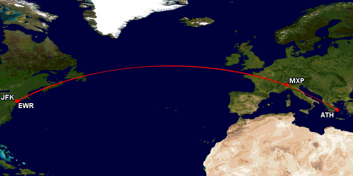 Of course, Emirates is not the only airline operating these routes. If we lump JFK and Newark together and look at flights from the New York area to Milan, we can see that all three US legacy carriers fly the same route (along with Alitalia and Air Italy). Both United and Delta also fly nonstop from New York to Athens, though for the purpose of this post, I'll focus on Milan where the competition is the fiercest.