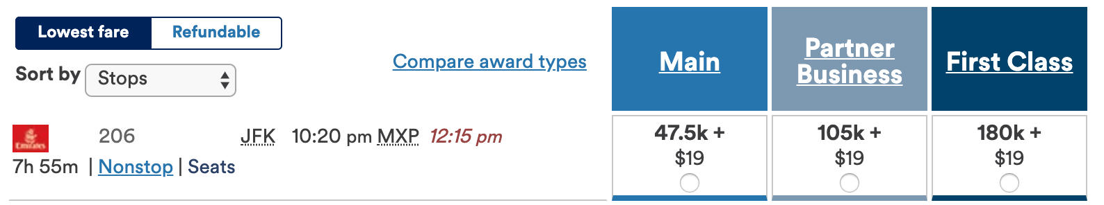 The award rate for Emirates isn't bad either — 62,500 miles is a hair above the what most carriers charge for a one-way business class award to Europe. The $550 in taxes and fees does sting, but at least you know you'll be getting a greatly-improved flight experience, from food to seat to service.