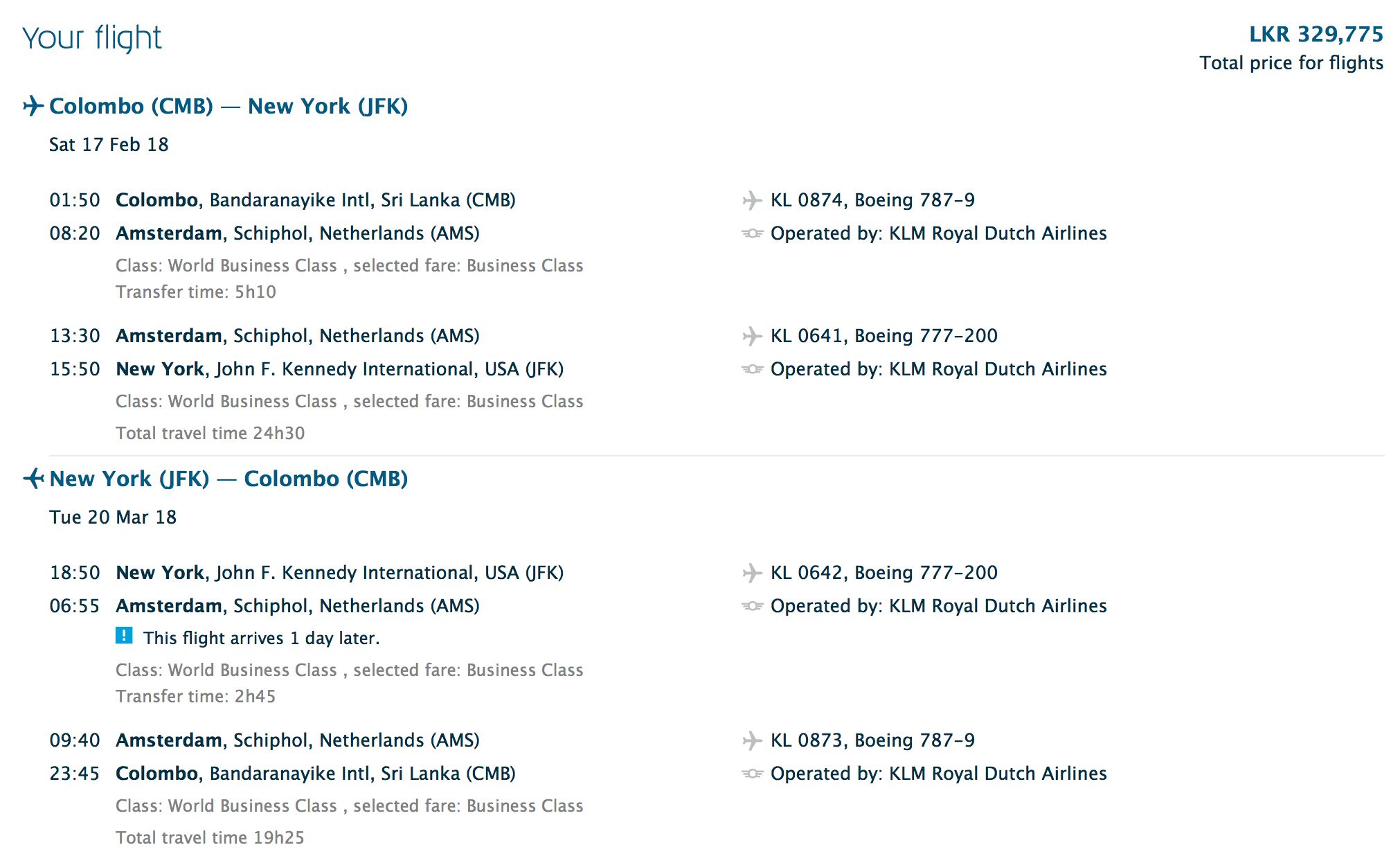 You can do far better by booking a round-trip flight originating at CMB. For example, I'm seeing fares from Colombo to New York for $2,147 in KLM business class, including flights on the airline's new Boeing 787 Dreamliner. Booking just Amsterdam to New York on the same dates will run you more than twice that amount.