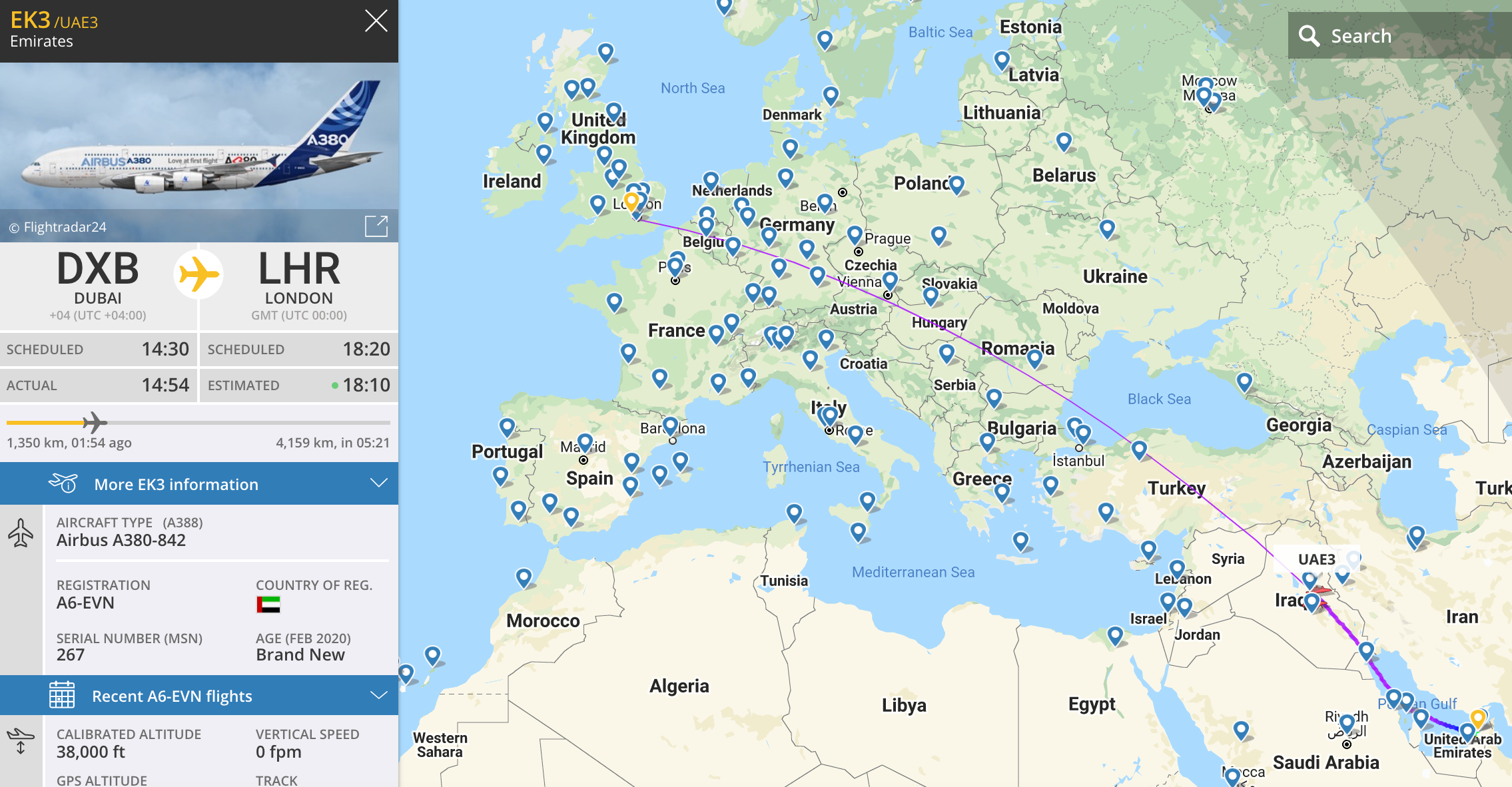 The airline's newest A380 — registered A6-EVN — is the first aircraft to be fitted with Emirates' first-ever premium economy product. It departed from Dubai (DXB) for London (LHR) just before 3:00.