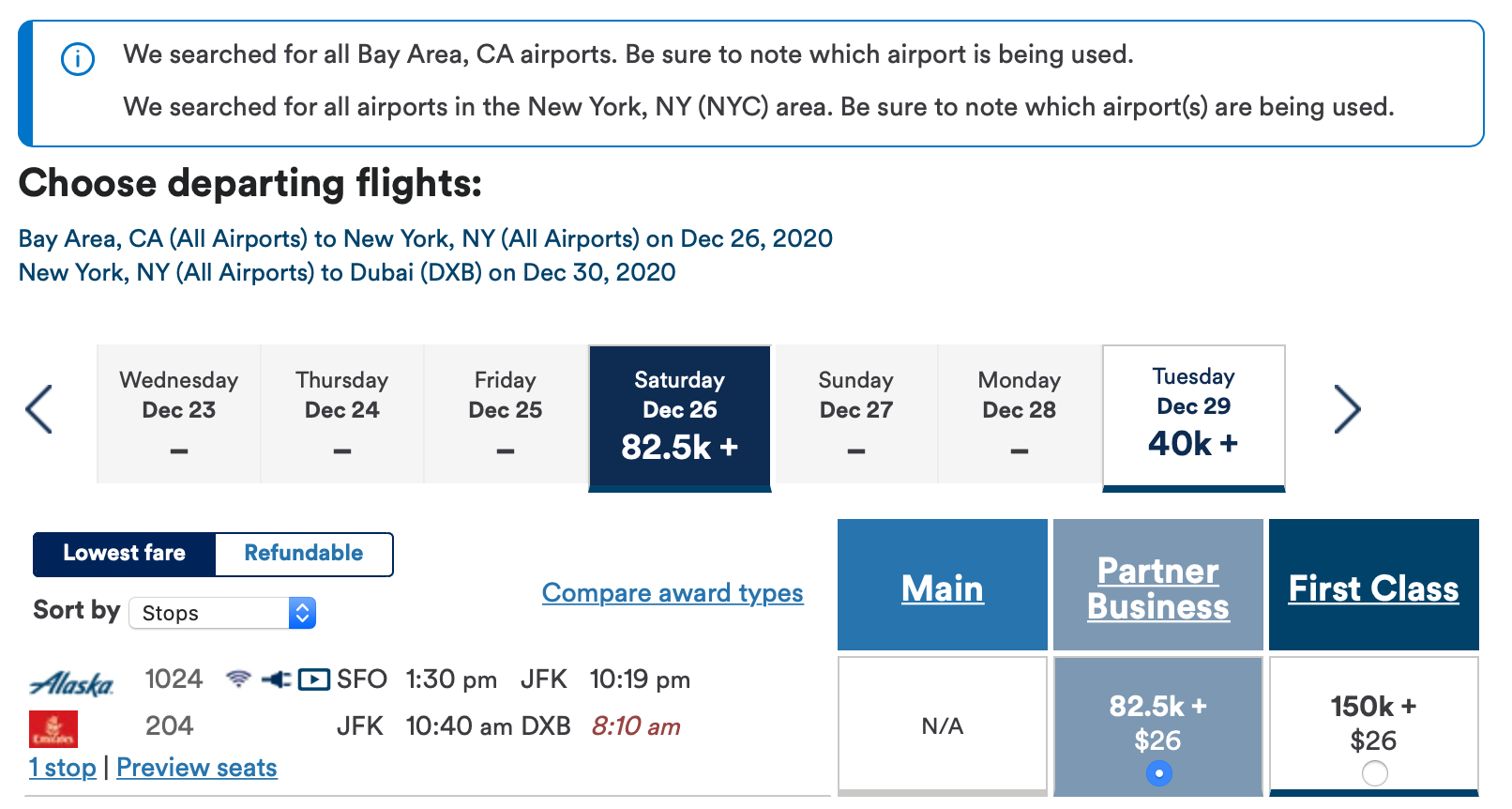 Alternatively, you can add in a domestic stopover with Alaska Airlines. For example, you can book San Francisco (SFO) to Dubai (DXB) via New York-JFK for just 82,500 miles and $26 in taxes and fees in business class. The first leg would be in Alaska Airlines' domestic first-class, and the continuing leg would be in Emirates business class.