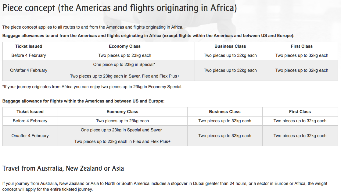The piece concept applies to all routes to and from the Americas and flights originating in Africa. In this case, Special Economy is taking a hit by having its usual two pieces up to 23kg apiece reduced to one unless the journey originates in Africa.