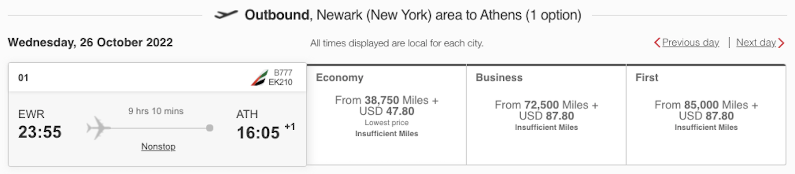 For the Emirates fifth-freedom flight from Newark Liberty International Airport (EWR) to Athens International Airport (ATH), here is the pricing from our update in February.