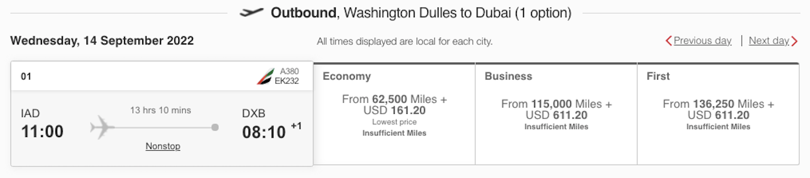 Last month, we reported that fuel surcharges had jumped as much as $250 on some routes. Here's a sample flight from that article, flying from Dulles International Airport (IAD) to Dubai International Airport (DXB).