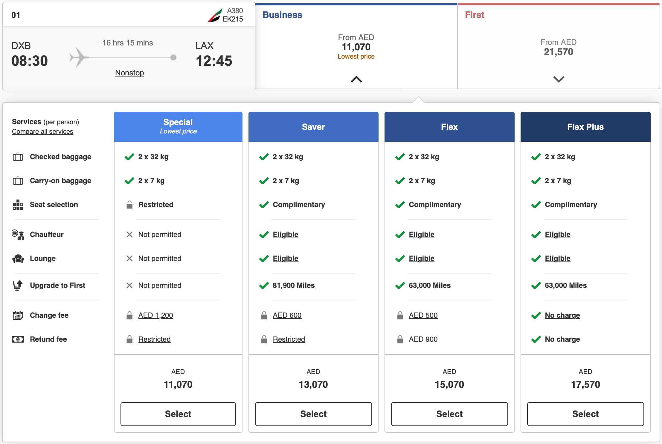 As with basic economy on other carriers, the price difference between Special and Saver business class fares vary by route, but based on what we're seeing, it is significant. For instance, while there was a roughly 15% ($410) difference in the Dubai-to-Newark example above, that difference went up to about 17% ($544) between Dubai and Los Angeles (LAX).