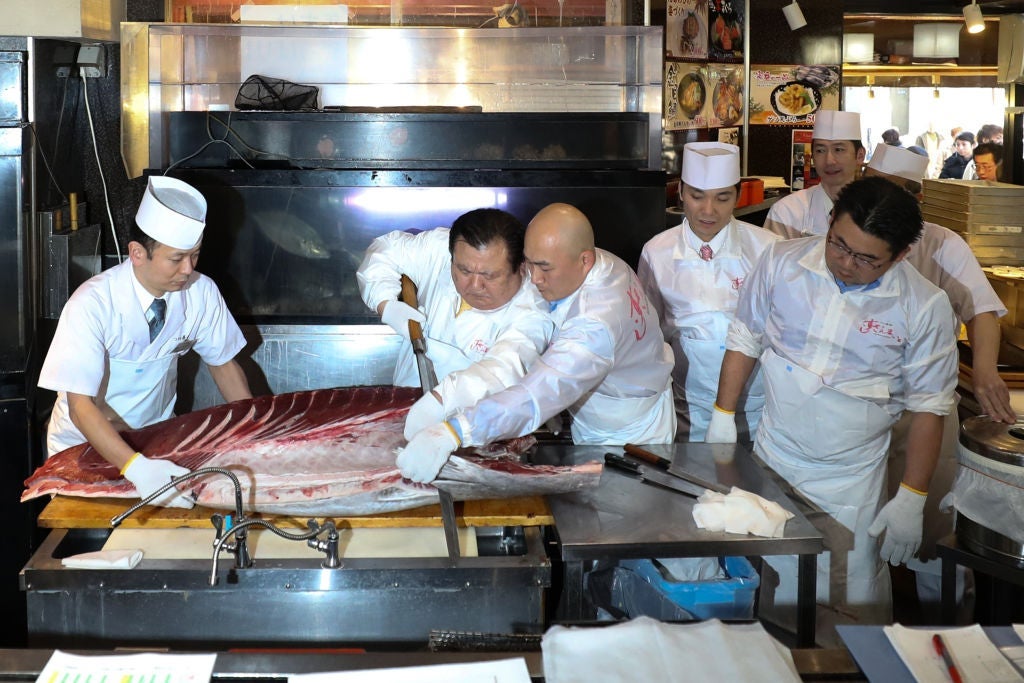 TOKYO, JAPAN - JANUARY 05: Kiyomura Co. President Kiyoshi Kimura cuts a fresh bluefin tuna at one of the company's Sushi Zanmai sushi restaurants after the year's first auction at Toyosu Fish Market on January 05, 2019 in Tokyo, Japan. Kiyomura Co. bid for the highest priced tuna weighing 278 kilogram (612lbs) for 333.6 million yen ($3.07 million) at the year's first auction. (Photo by Takashi Aoyama/Getty Images)