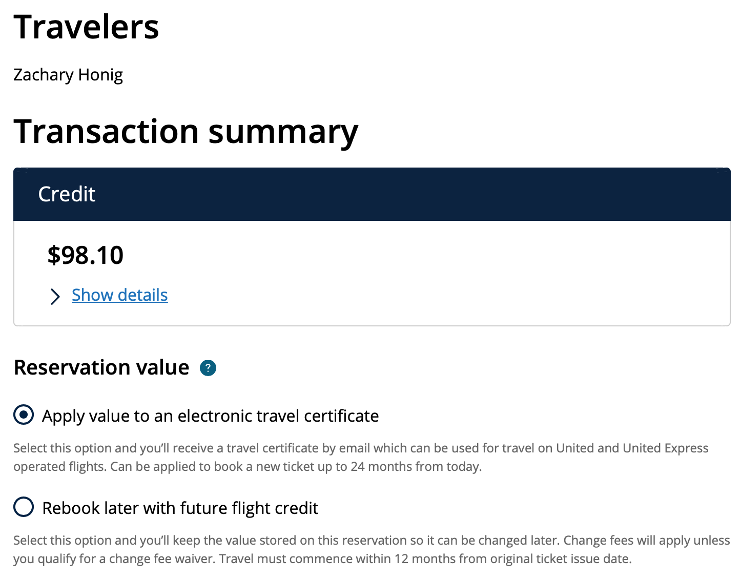 While the above ticket was booked with a credit card, I was also able to receive an ETC refund after canceling a flight I booked with an existing travel certificate. In that case, the option didn't appear online, but a phone agent was able to make the request, and the new ETC was in my inbox just four days later.