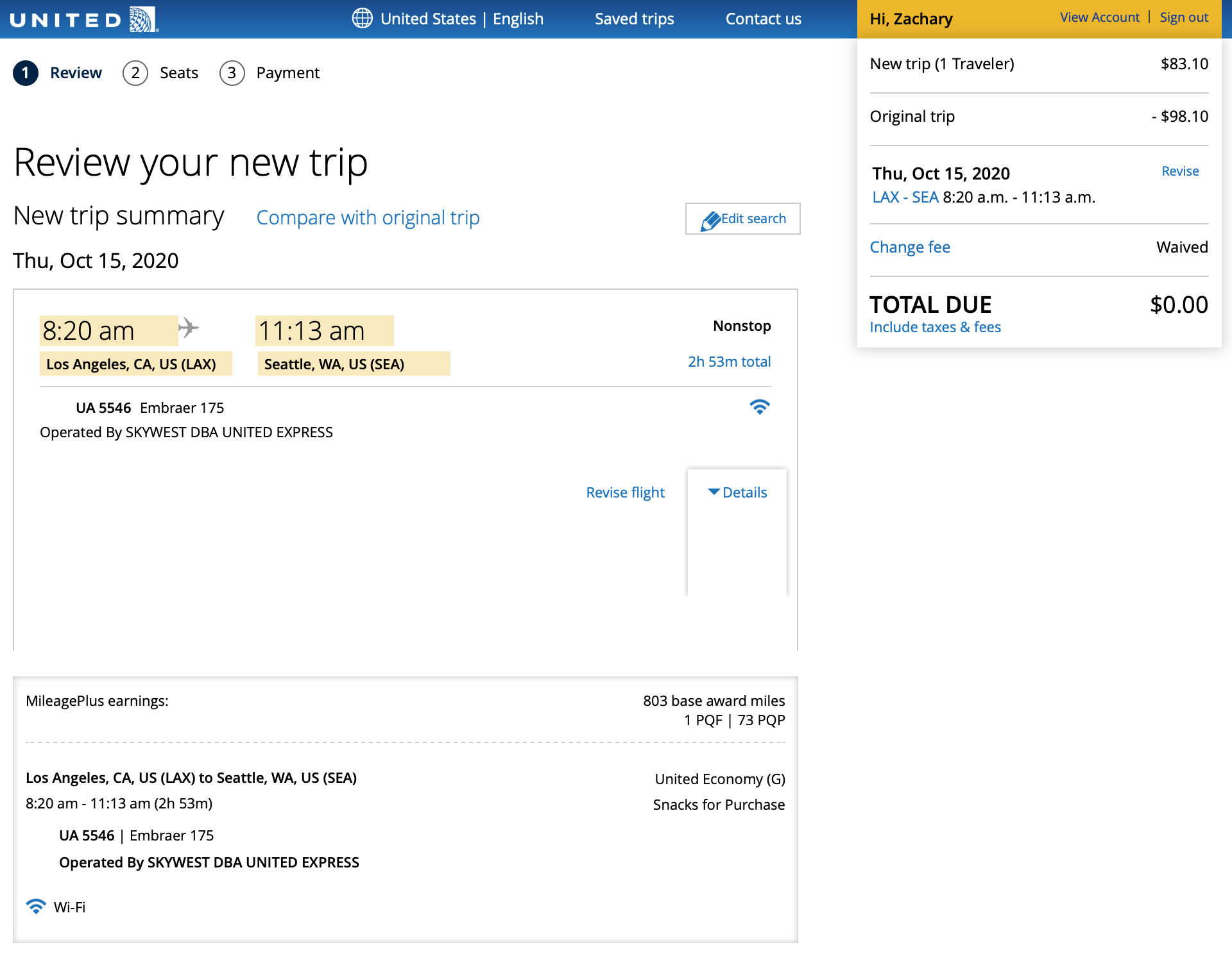 As United explains in the terms and conditions, you'll end up forfeiting any residual value if you change to lower-cost flights. In the example below, I booked a flight for $98.10 and selected new flights for $83.10 — while the $200 change fee was waived, the difference in cost of $15 would have been lost, had I completed the change.
