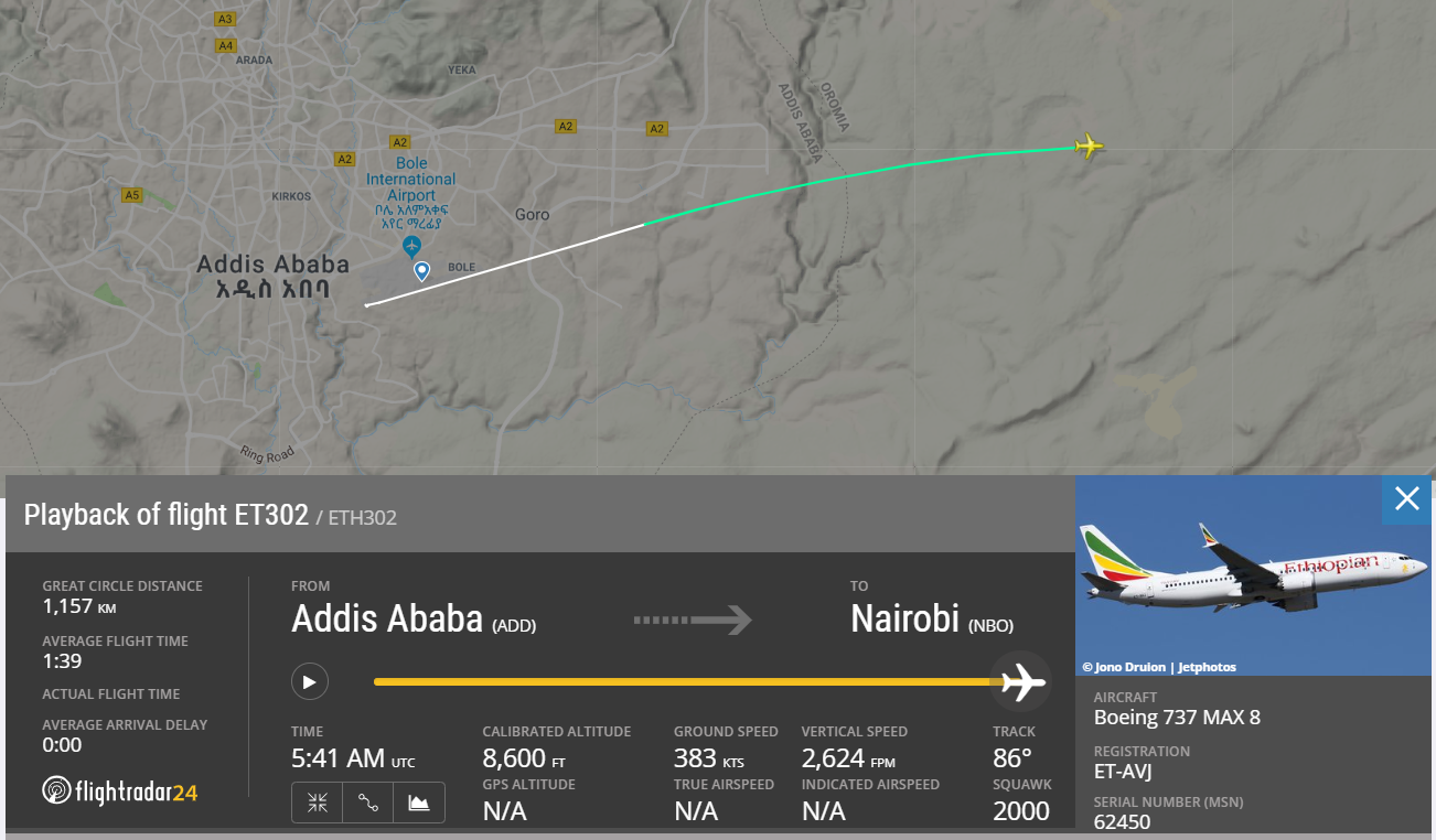 Ethiopian Airlines and Ethiopian government officials have confirmed that an Ethiopian Airlines Boeing 737 MAX 8 crashed shortly after taking off from Addis Ababa International Airport (ADD). The flight Ethiopian Airlines ET302 was en route to Nairobi, Kenya (NBO).