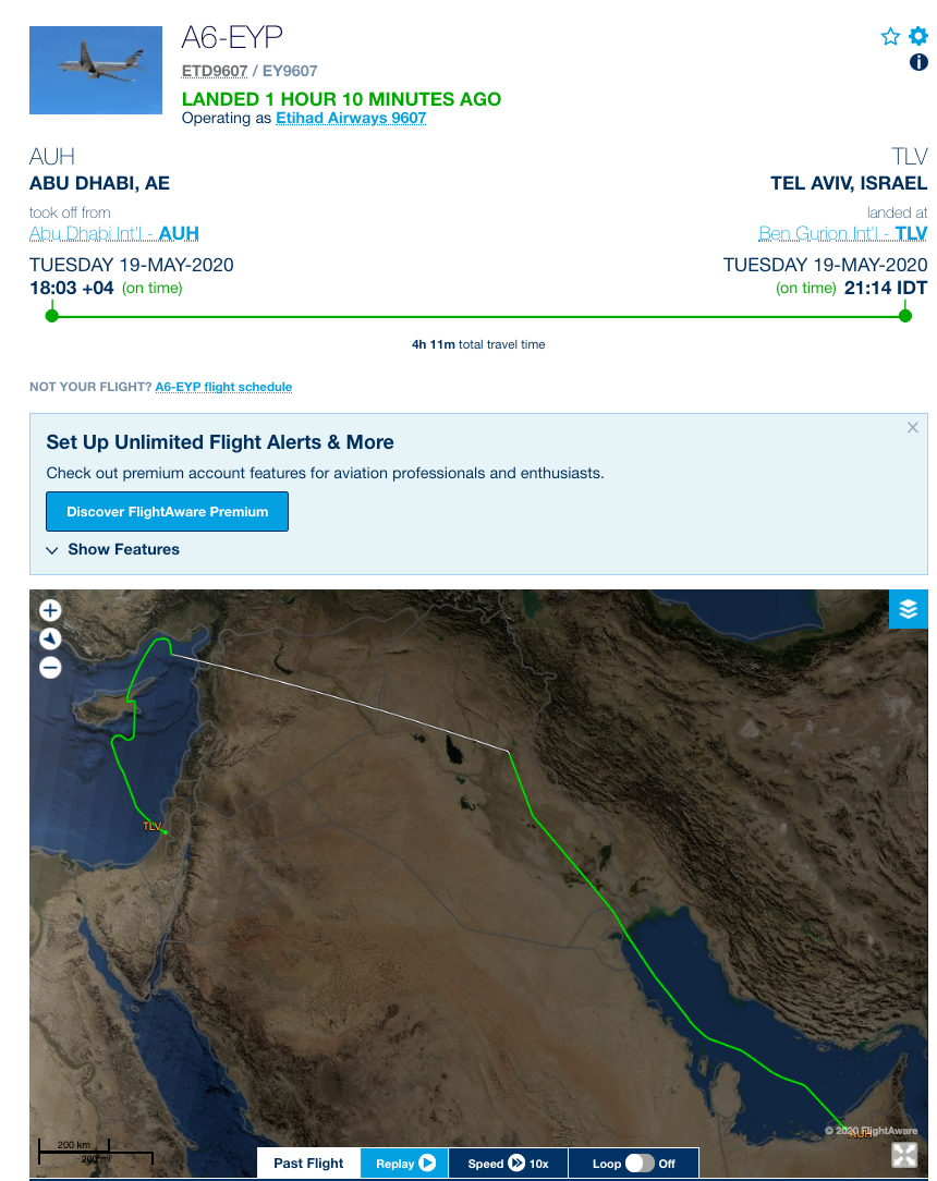 A tweet by Israel's Ambassador to the United Nations Danny Danon showed a flight track from Abu Dhabi to Tel Aviv by an A330 registered A6-EYP, confirming the identity of the jet. In the tweet, Danon expressed a wish that passenger flights would soon follow.