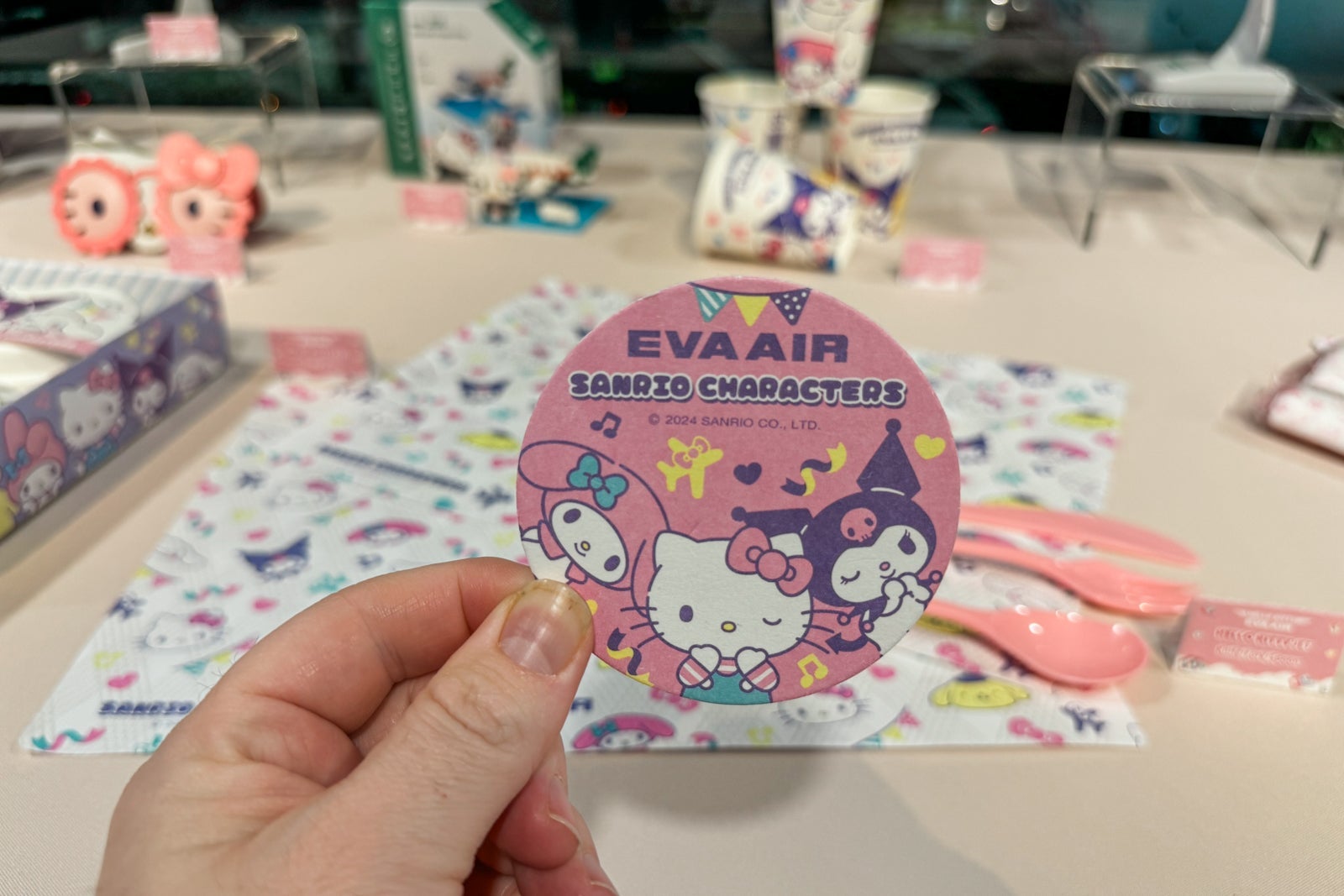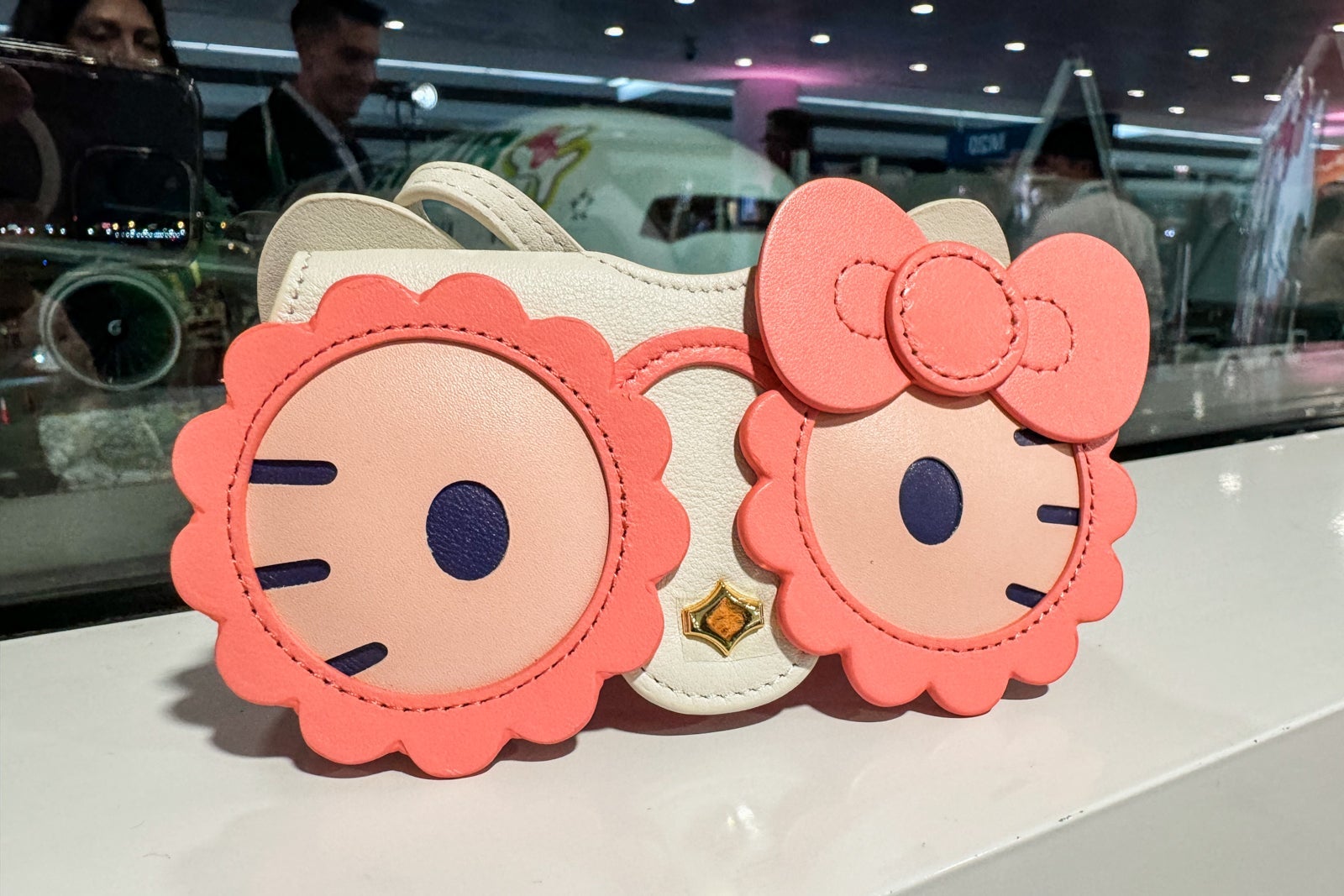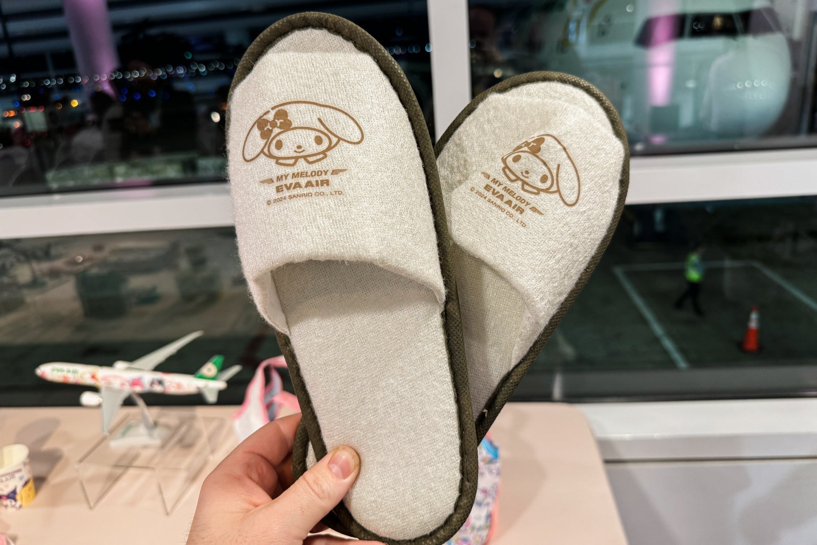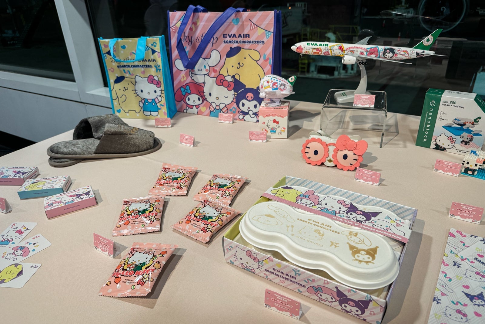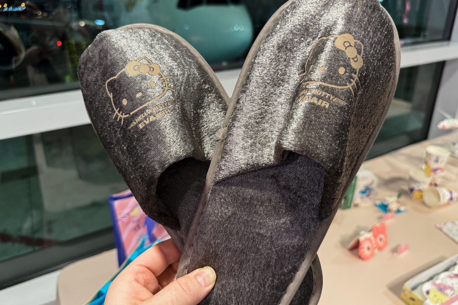The carrier showed off the complimentary and duty-free items available on these themed flights, including Hello Kitty headrest covers and slippers for passengers in each cabin. (The black ones are for business class.)