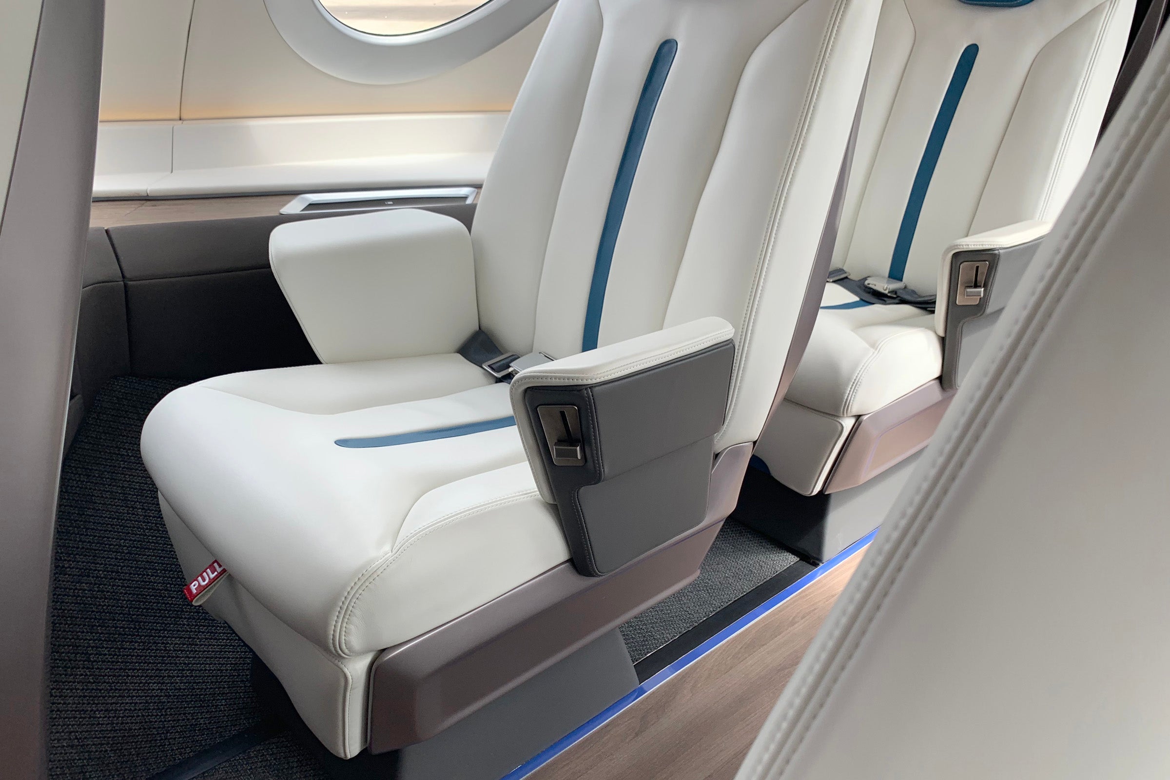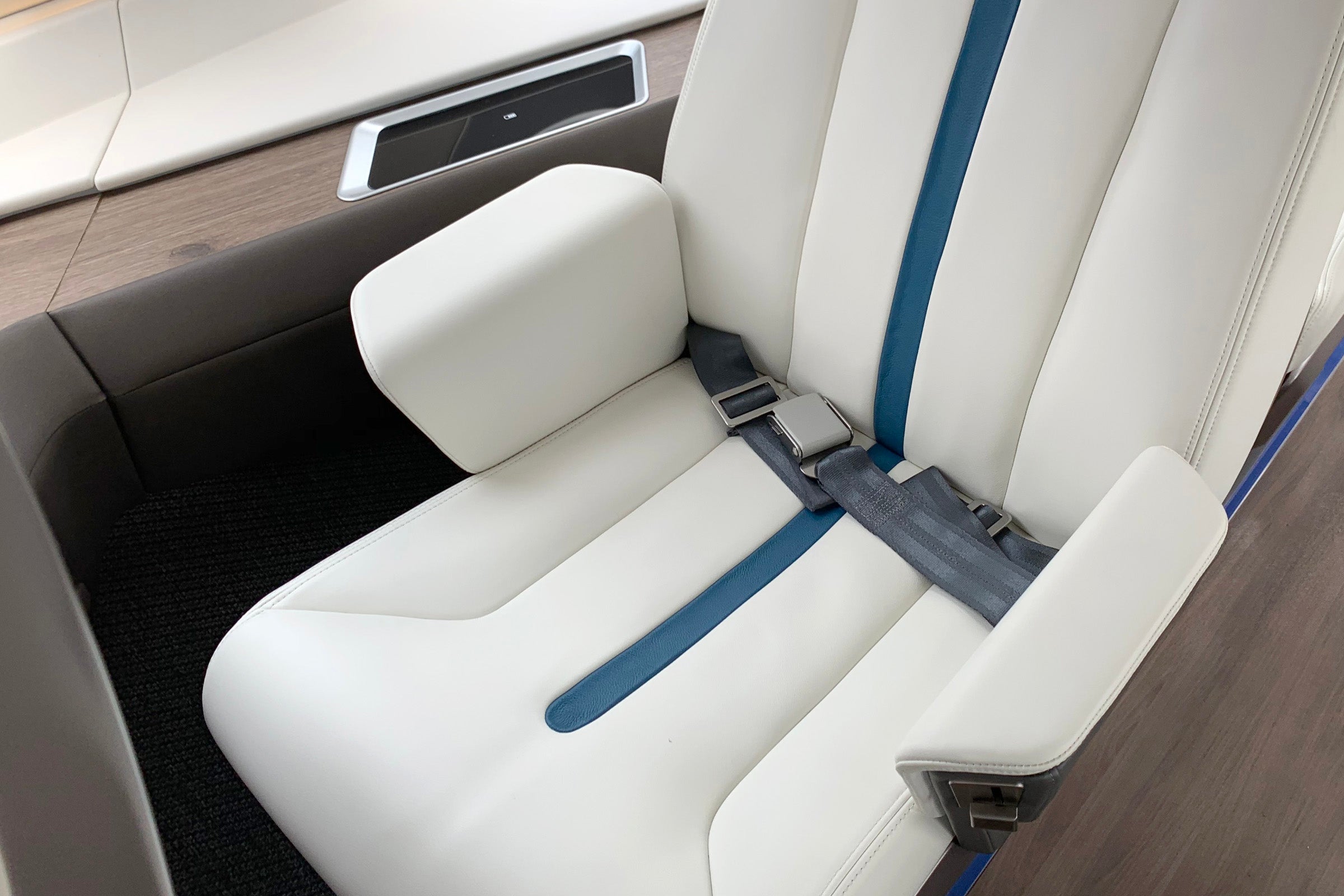 I really love the seats installed on the test plane — they're made of a cushy leather, and have a nifty swivel feature that makes it easier to see out of the gigantic windows.