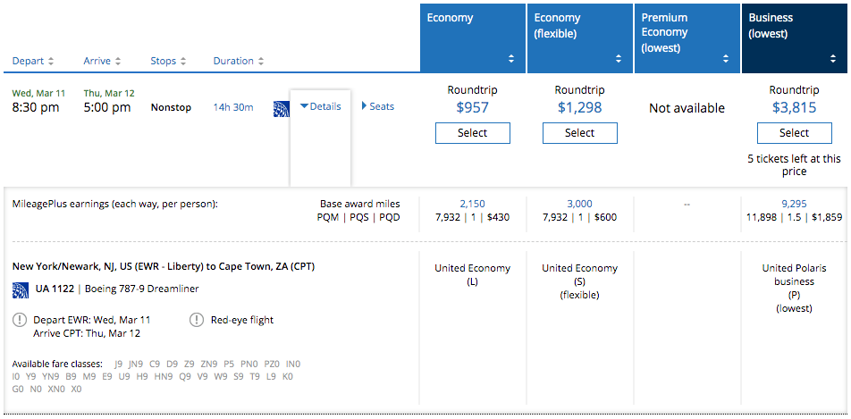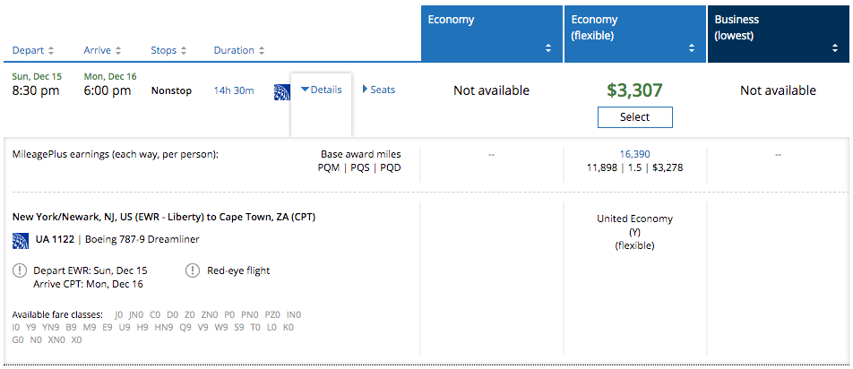 We can hold out hope that rates will drop as we get closer to launch, though I'm not terribly optimistic. United's new EWR-CPT flight only operates three days a week, and for a period of just over three months, from Dec. 15, 2019 through March 27, 2020. I think demand will be especially high, given the short run-time, and how far in advance the airline announced service. And while these nonstop United flights may eventually be bookable at far lower rates through partners, that doesn't appear to be the case right now.