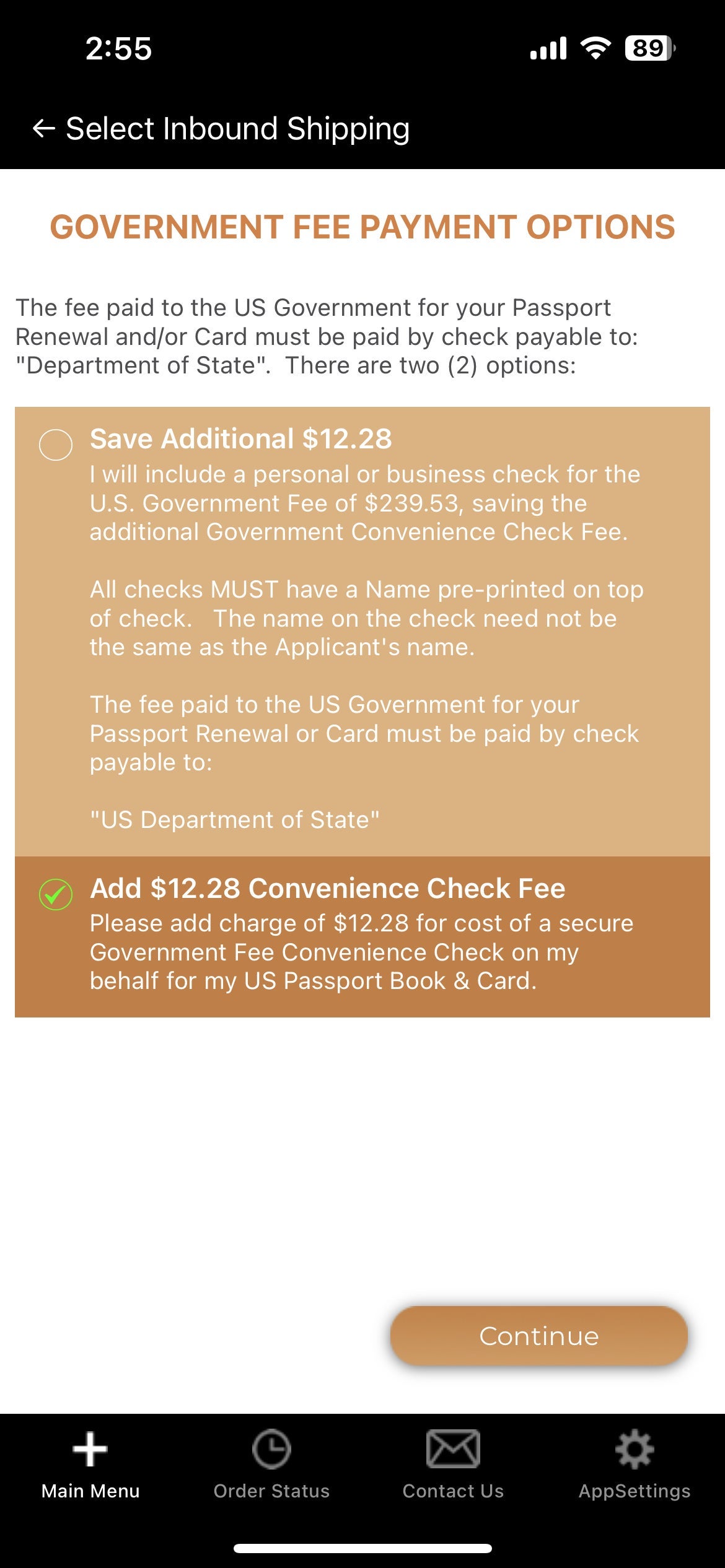 Next, choose return shipping through either USPS Priority Mail with tracking (which is included in your application fee) or USPS Express Mail with tracking for an additional charge of $21.36. You also need to decide whether you want to pay a $12.28 convenience fee for ItsEasy.com to send the federal government a check on your behalf or if you want to make a check out to the government for the full amount of your application.